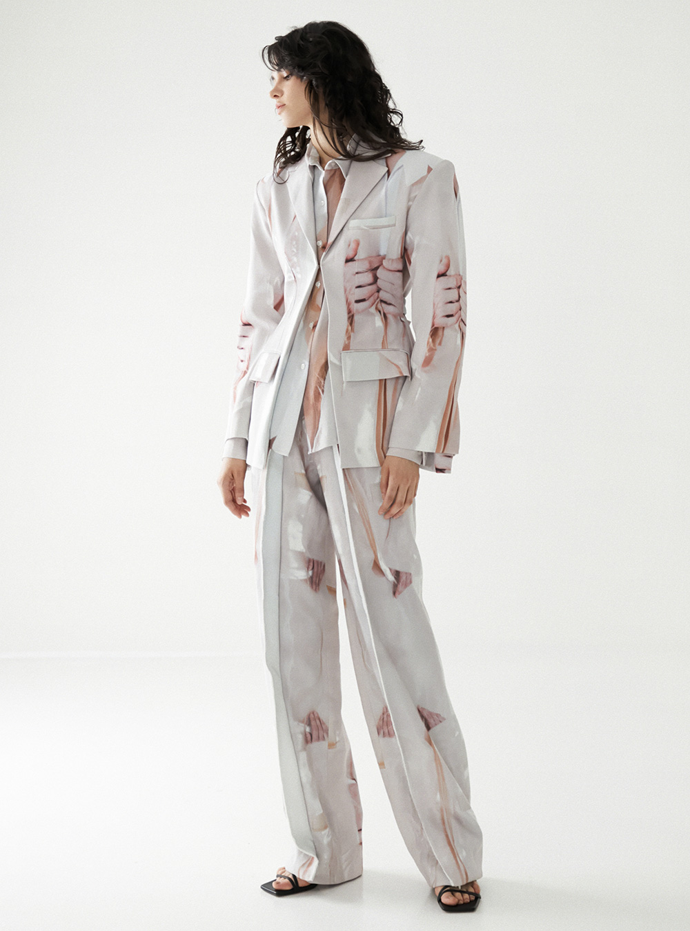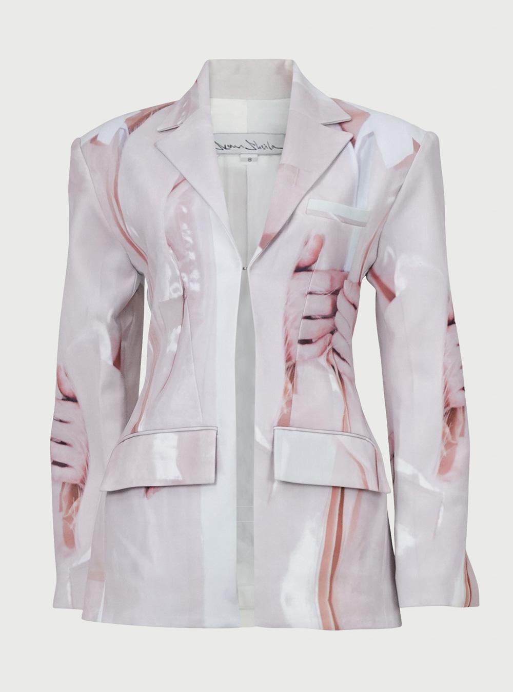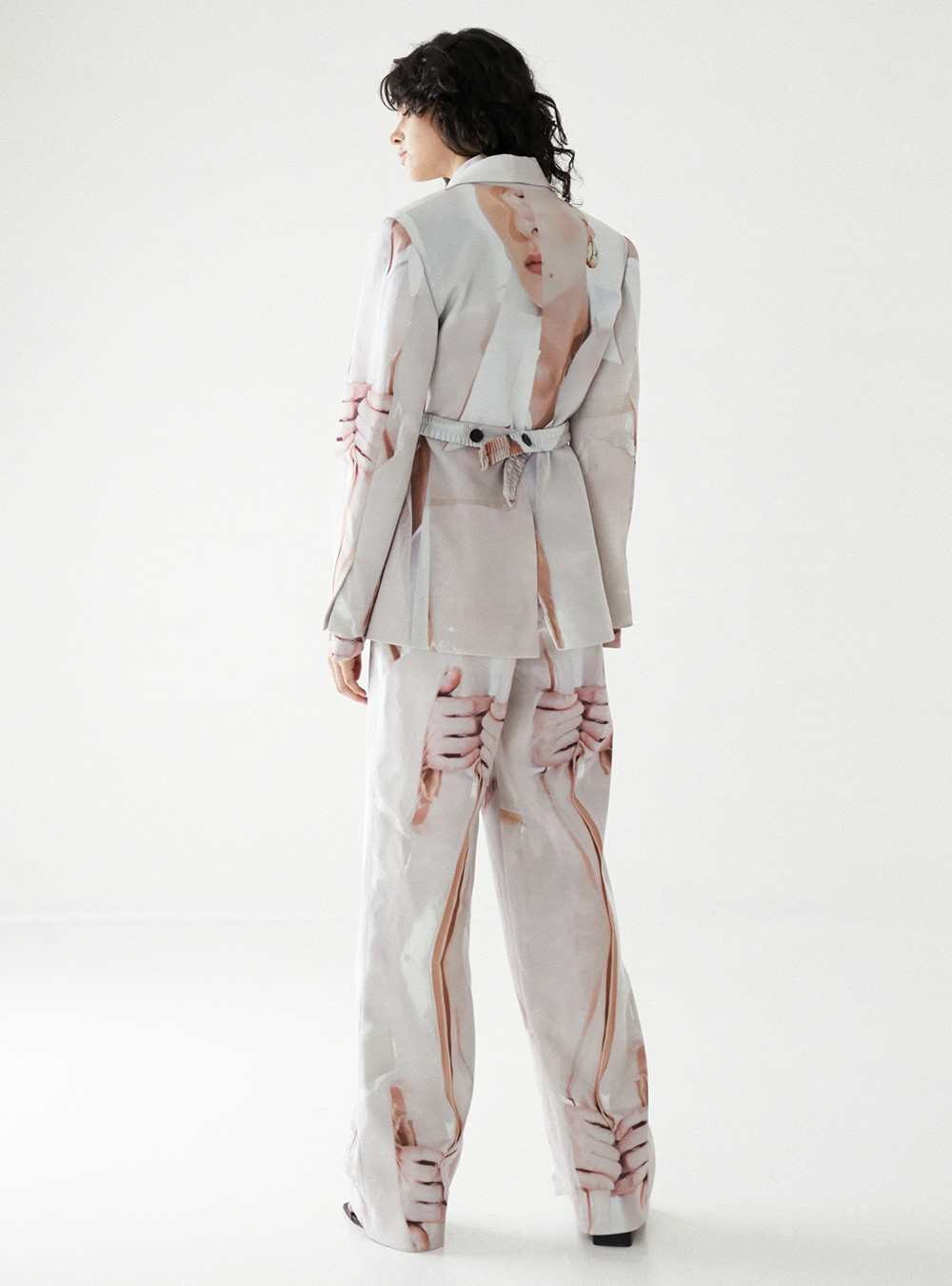 A fresh take on a classic suit jacket, this Abstract Printed Suit Jacket from Sean Sheila’s latest collection features printed visuals from their previous seasons – creating a unique homage to the brand’s history. The jacket features an adjustable belt to create a defined waist.