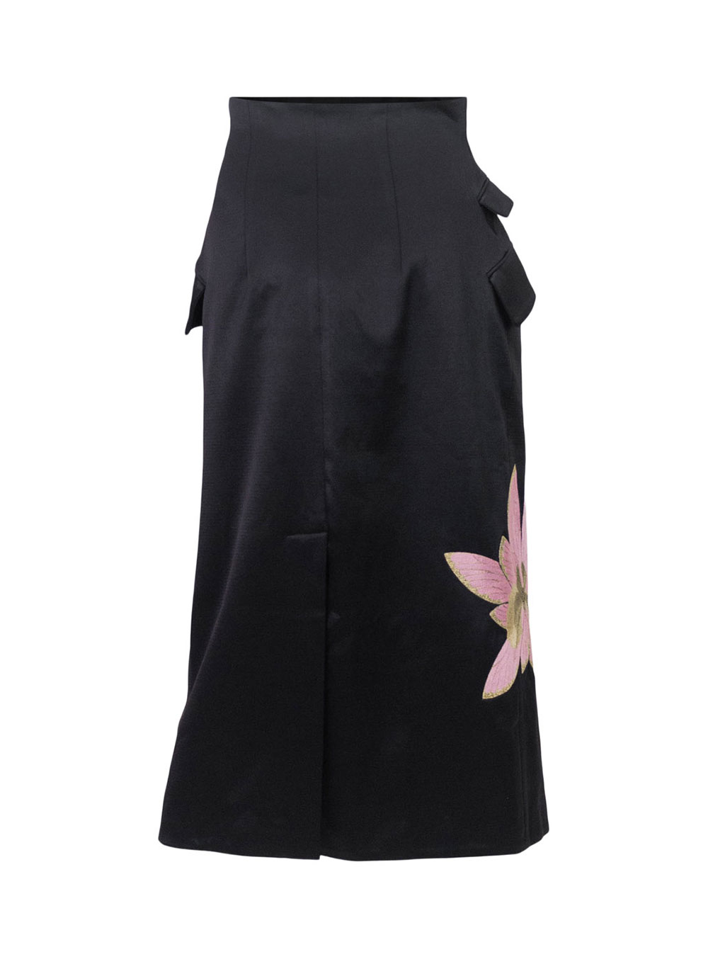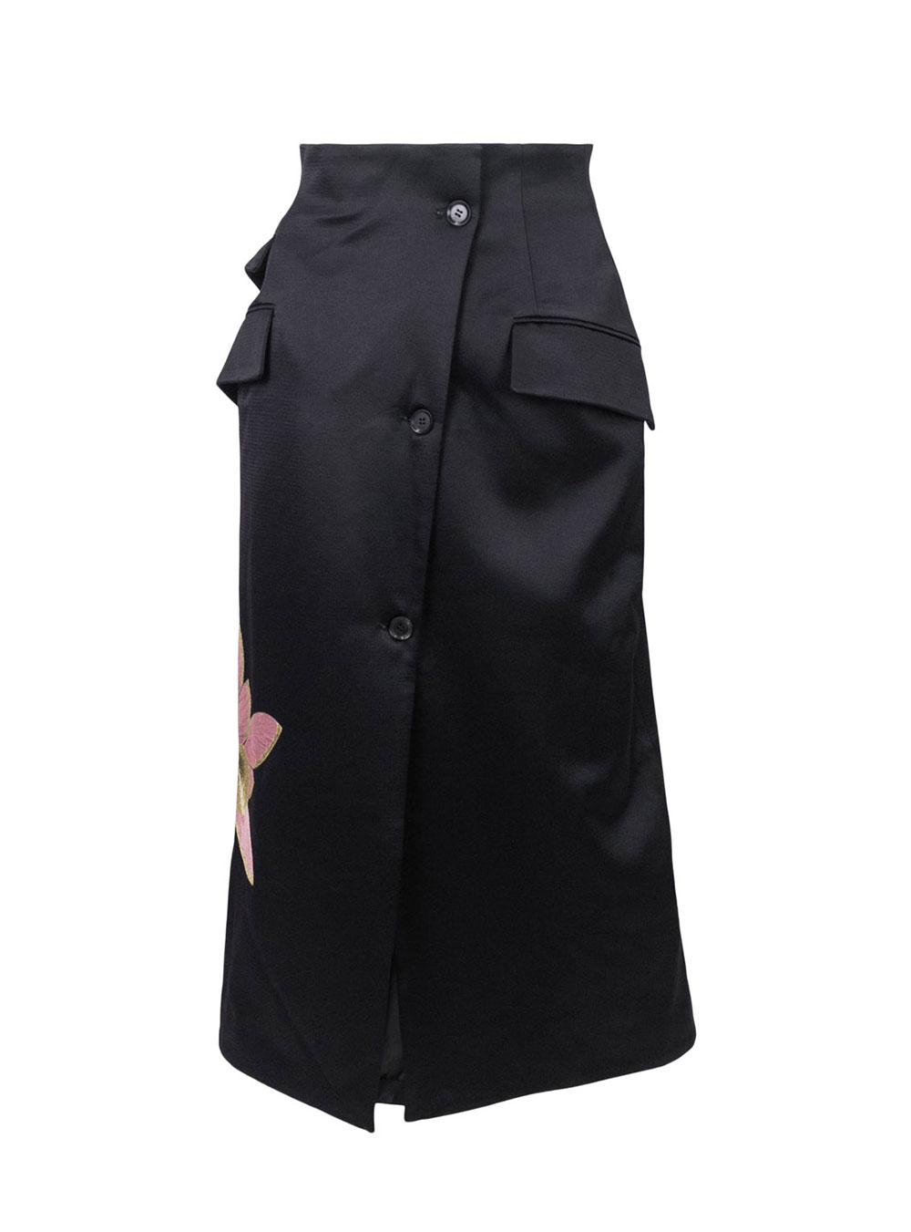Asymmetrical tailored skirt with flap pockets and embroidery details.