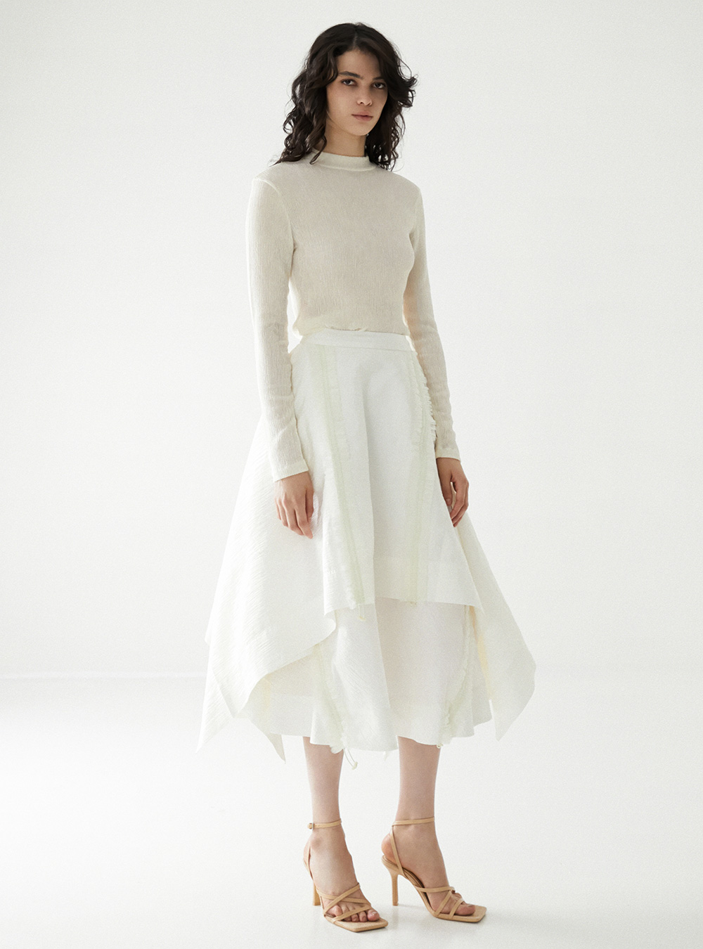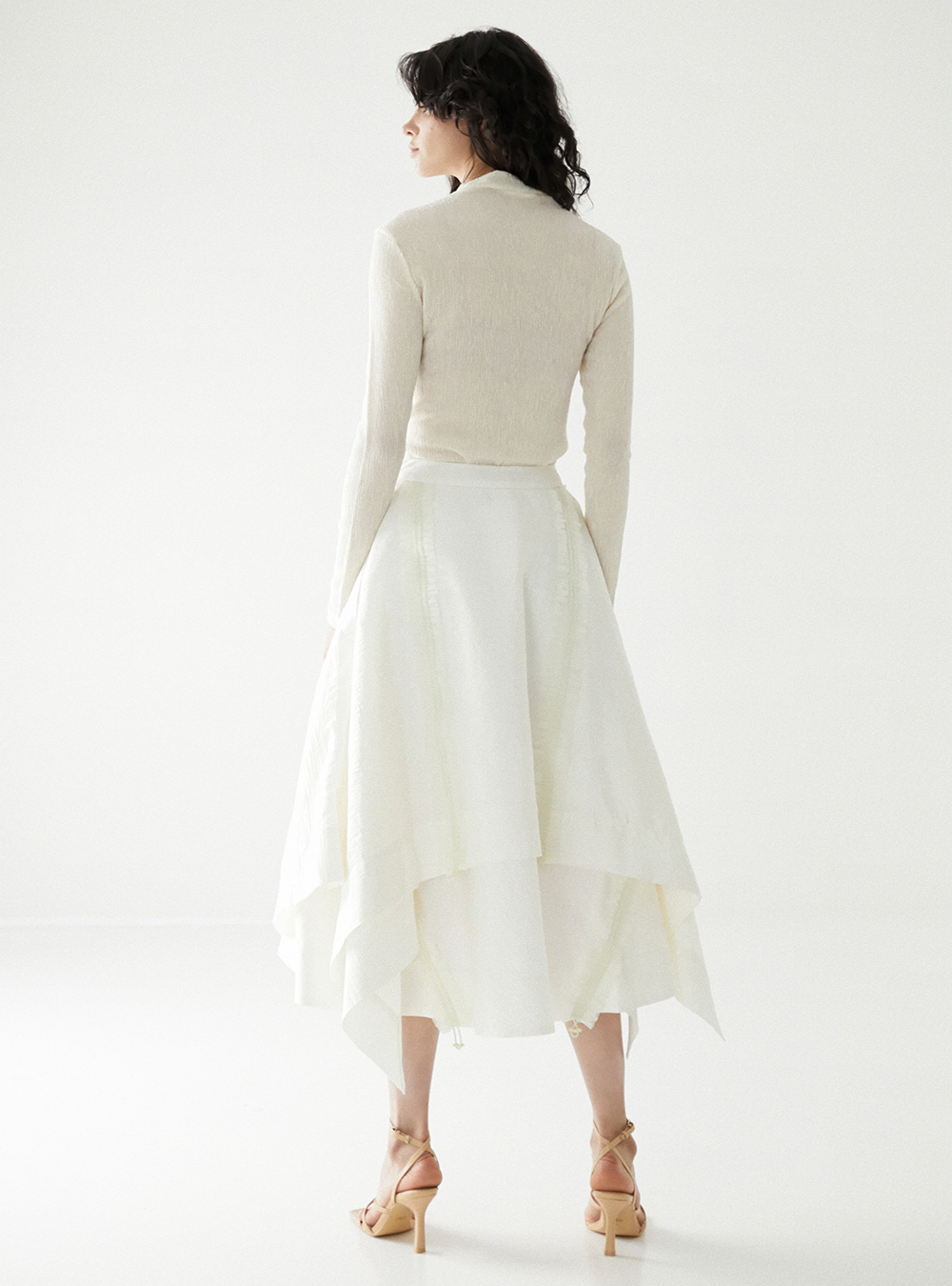 Minjukim Fall/Winter 2022 continues to explore Bari, the only god in Korean mythology to travel between the underworld and earth – a continuation of the last collection. The Spring/Summer 2022 collection celebrates the hope for Bari’s happiness while this presents her courage and difficult journey through the afterworld. This season’s fabric showcases the shadow of flowers and shivering petals to represent blizzard of a dark, lonesome but calm look of the afterlife. The silhouette stepped away from the signature Korean influence, leaning more on wind coat and casual wears to emphasize the concept of travel through Bari’s journey. However, Korean traditional knots and asymmetrical touches on the silhouettes are still a highlight in this collection.