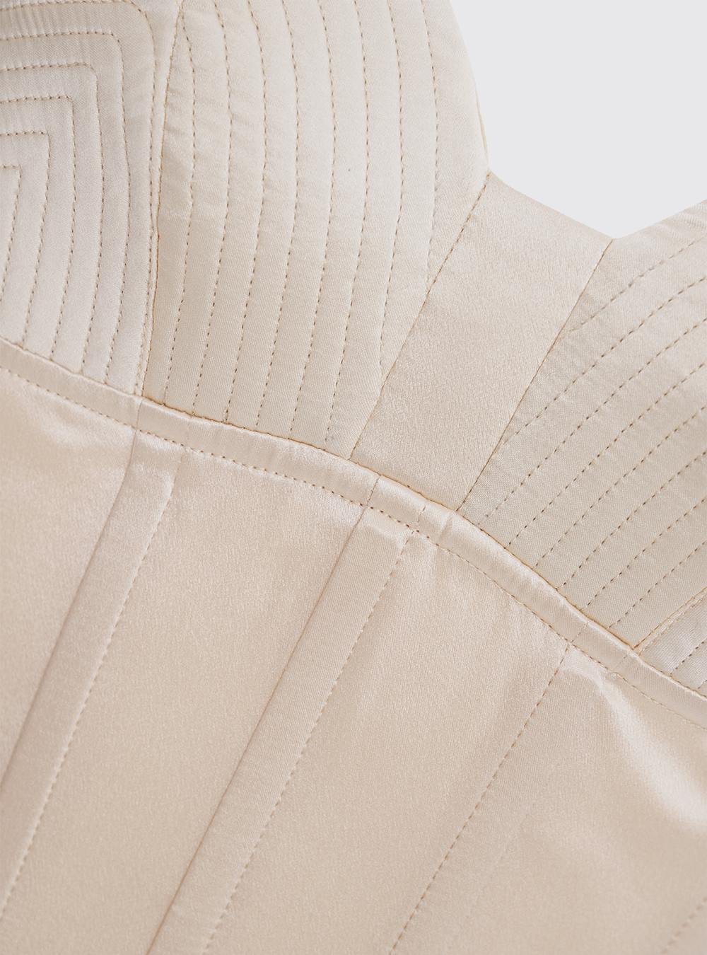 The Beige Silk Satin Corset Top combines classic elegance with a modern silhouette. Its luxurious silk satin fabric provides a refined sheen, making it a statement piece for any sophisticated look.