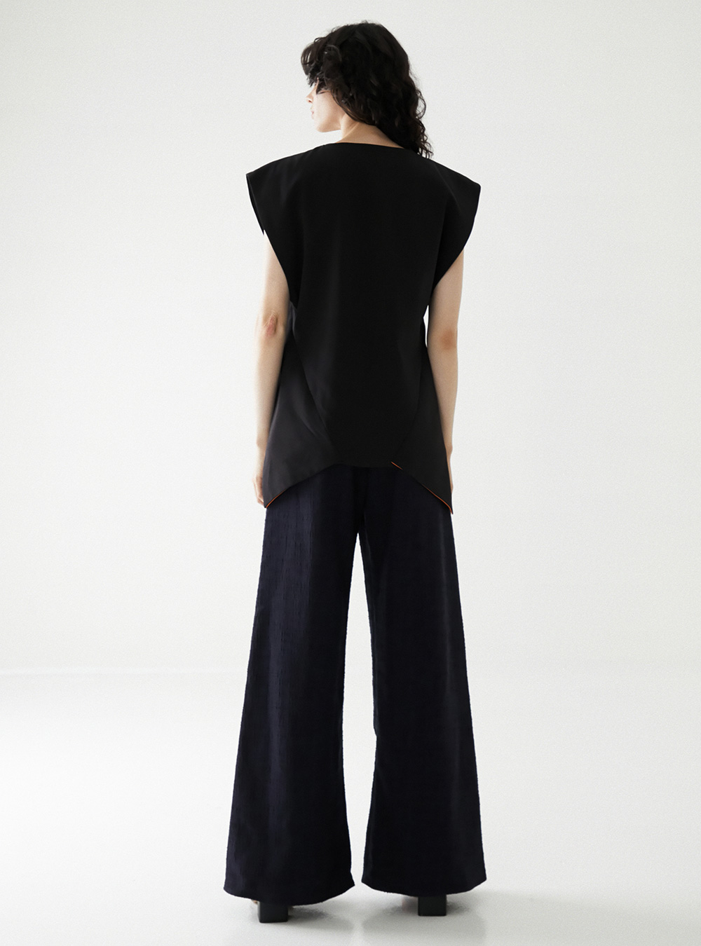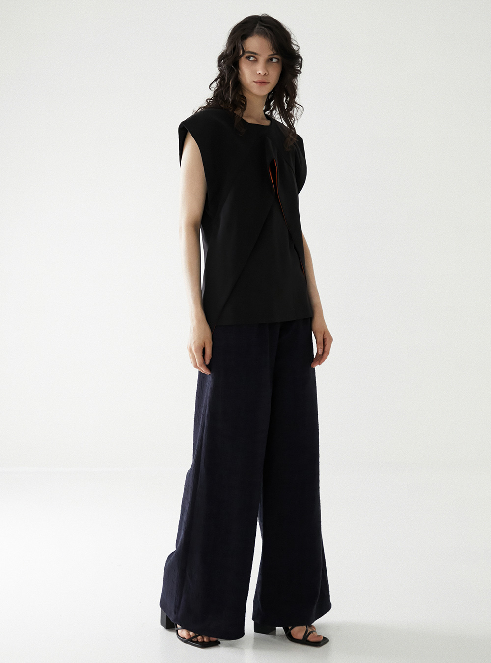 A simple black top is a staple in everyone’s wardrobe, and this top from Sean Sheila adds a little flair to simplicity. Constructed with a contrasting tangerine inner layer, this black top will certainly be anything but basic.
