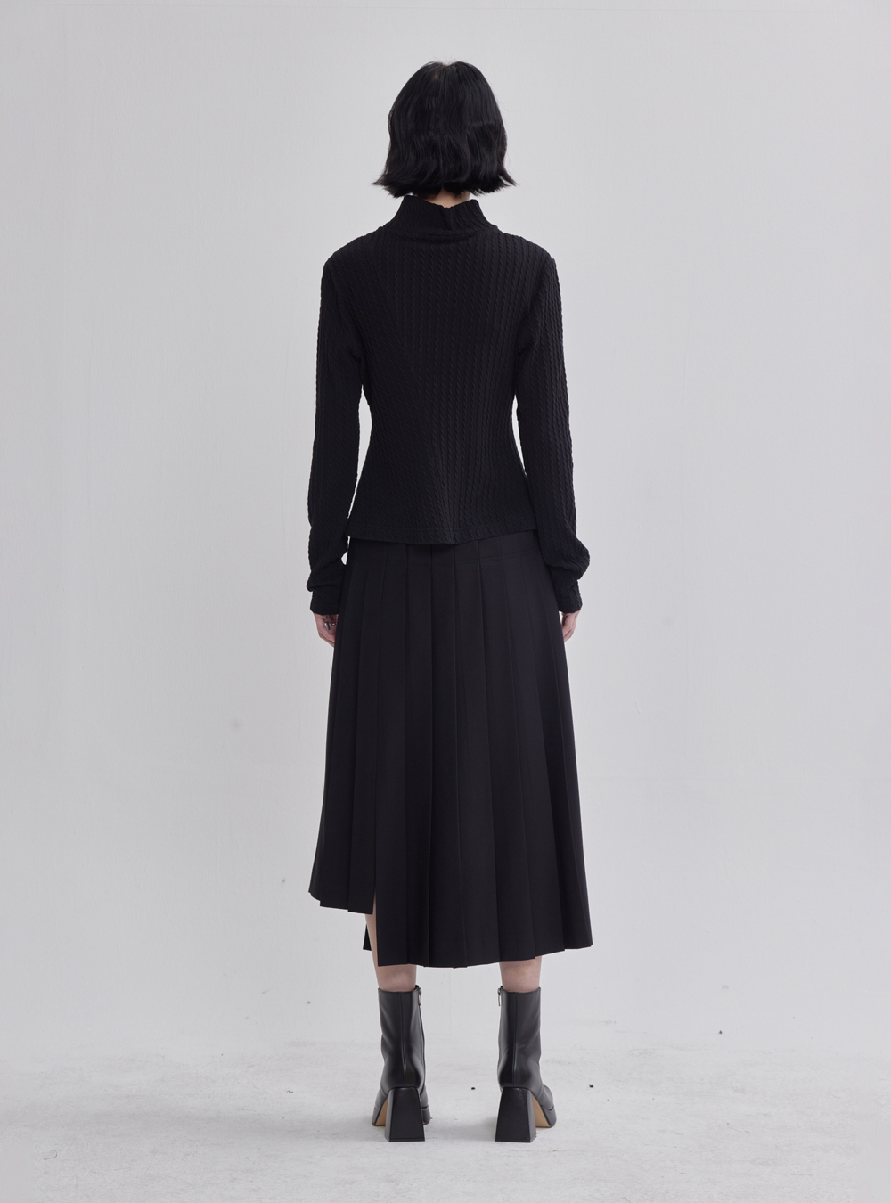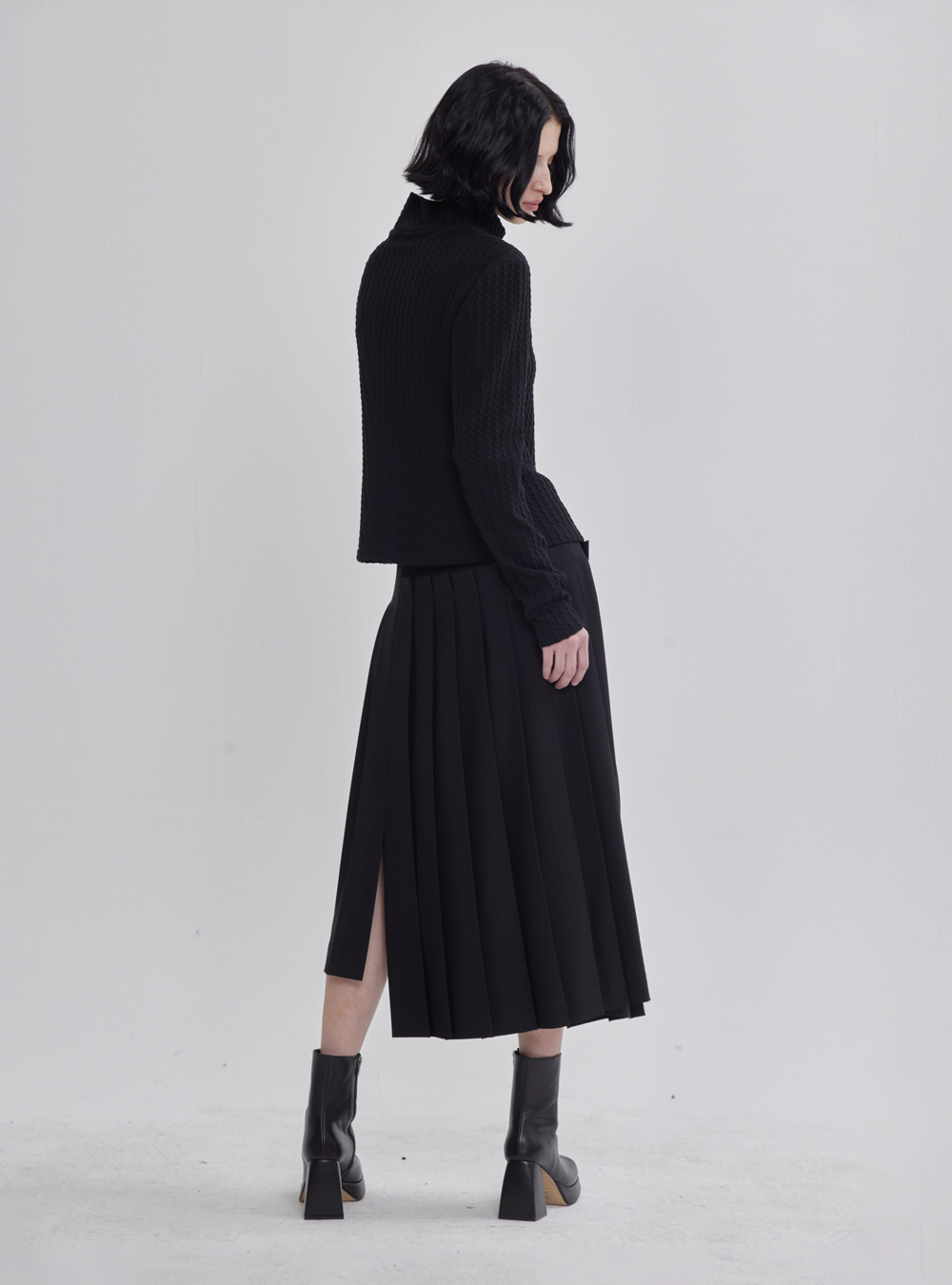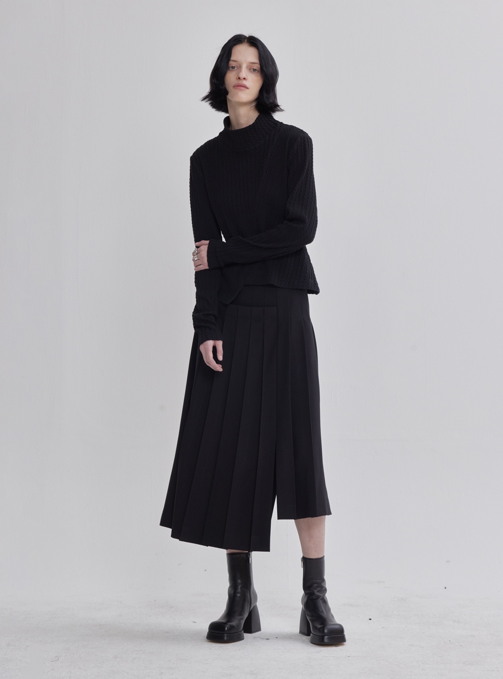 Make a daring style statement with the Black Unbalanced Pleated Skirt, an avant-garde piece featuring asymmetrical pleats for a fashion-forward and unconventional appeal.