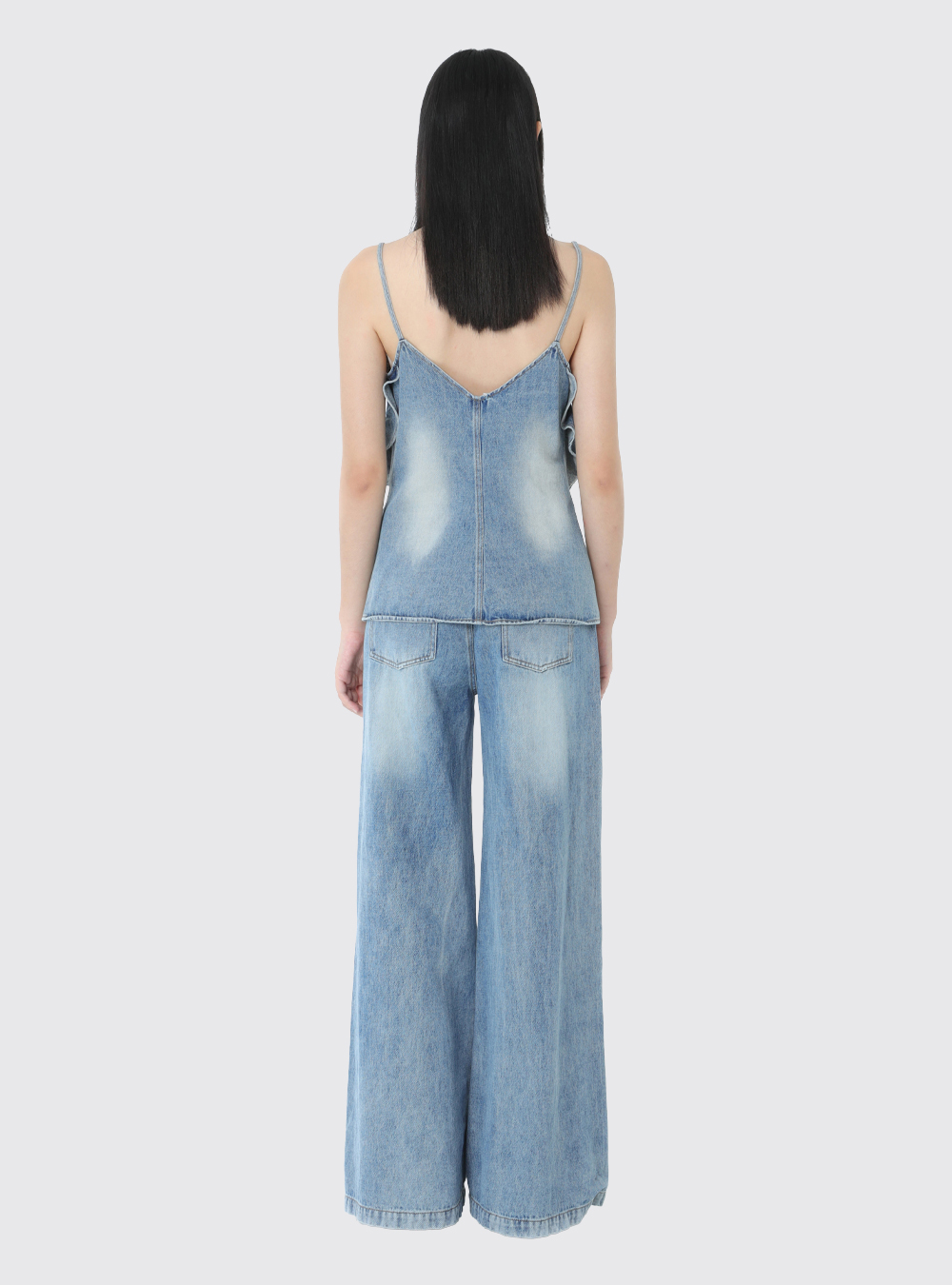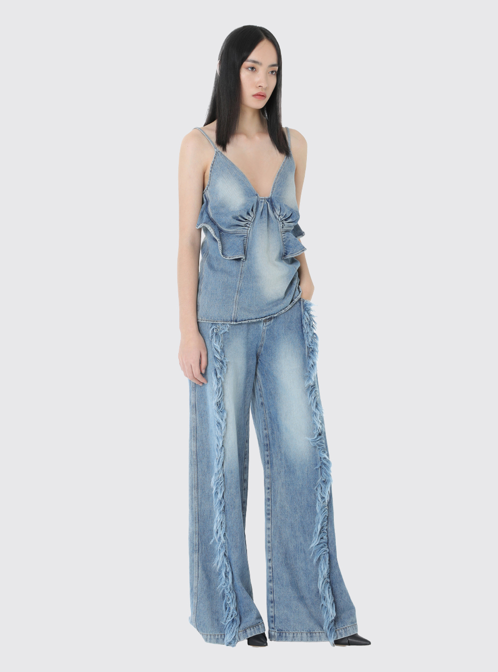 Revamp your denim collection with the Blue Washed Denim Trousers featuring Tassels. The tassel detailing adds a bohemian touch to the classic denim trousers, creating a versatile and trendy bottom for casual and eclectic styles.