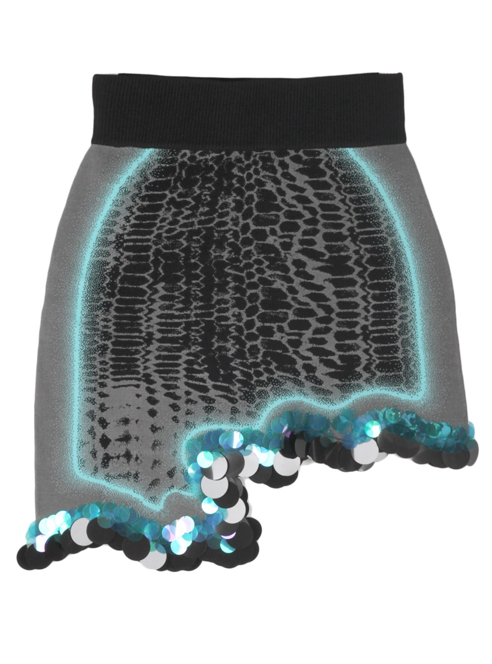 The Casey Wavy Mini Skirt is a signature piece crafted from sustainably sourced yarns and recycled sequins. Side border details create a slimming optical illusion, while the bold print and wavy hem make a striking statement.