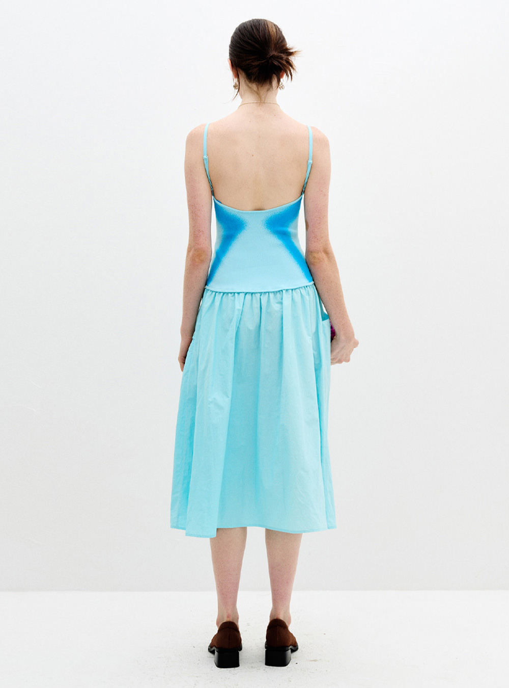 The Chili Mixed Media Tank Dress. A bold midi dress featuring a low-back, strappy design and vivid floral prints. Inspired by pioneering female scientists, it merges art and technology with striking, futuristic hues.