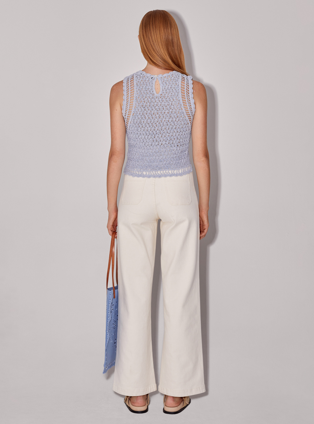 Crafted from a luxurious shiny cotton and hand knitted by women artisans in Bali, the Clothilde Top continues to celebrate Indonesian workmanship. The Top features a sleeveless design and different crochet techniques throughout the garment. Style this piece with a Magali Pascal bikini top to wear to the beach.