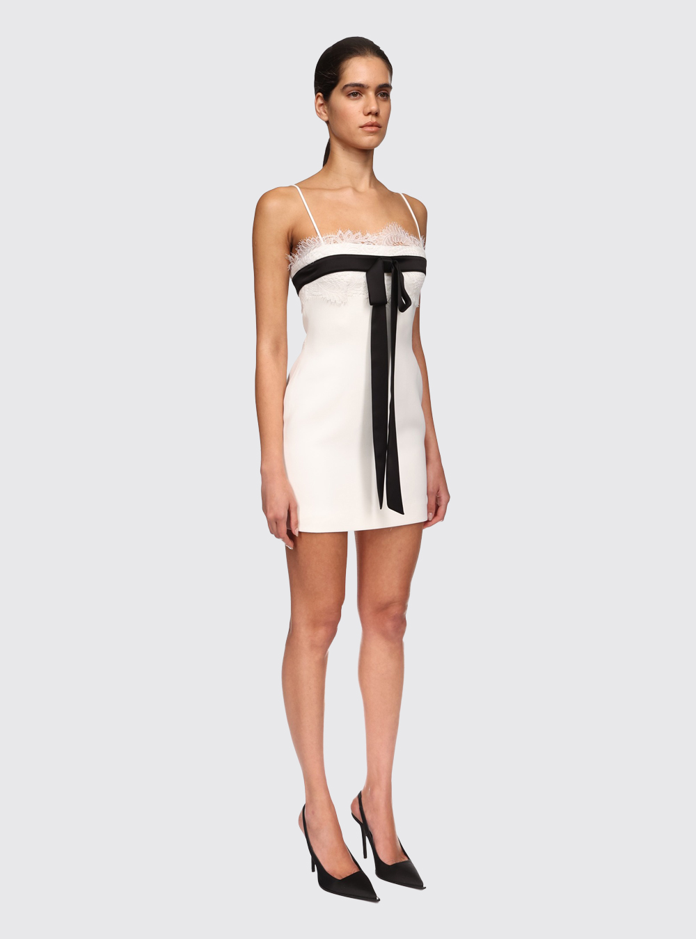 The Colour Contrast Lace & Satin Bow Detail Mini Dress combines colour contrast lace with satin bow details for a striking look. The intricate design and bold accents make it a perfect choice for those who love to make a statement.