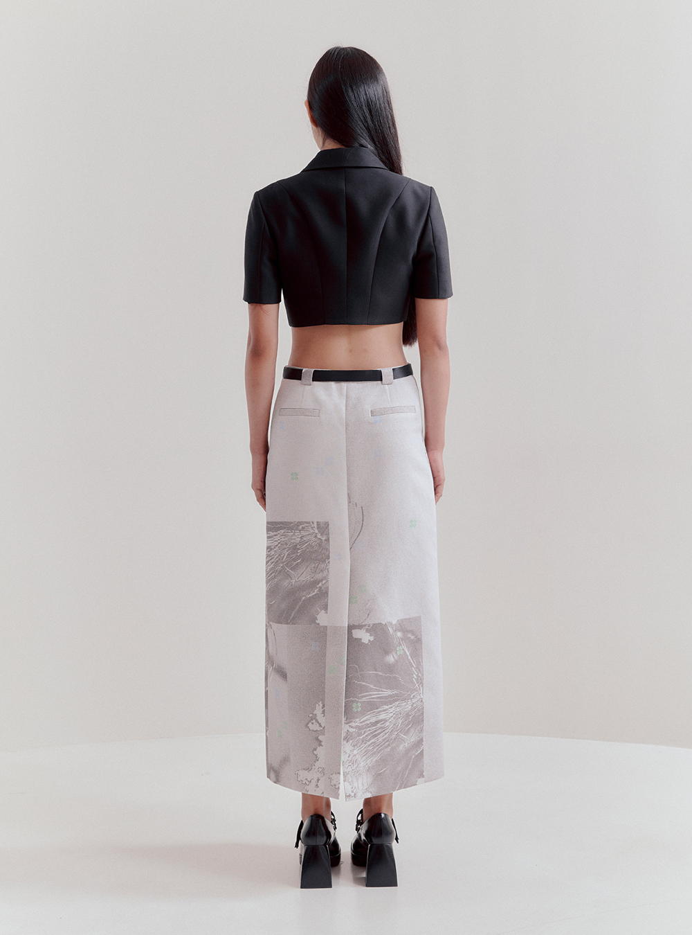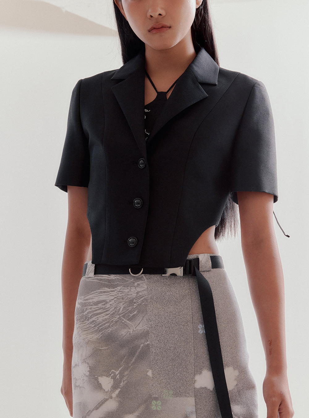 The Corset Short Jacket draws inspiration from the organic curves of a woman’s body with its tailored design. The short sleeves offer practicality, while floral buttons and wool-silk fabric add sophistication. Best styled with a pencil skirt for a sleek silhouette or denim pants for versatile look.