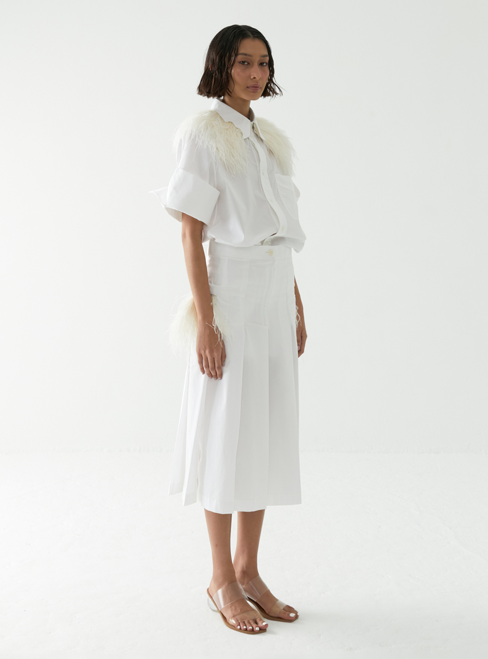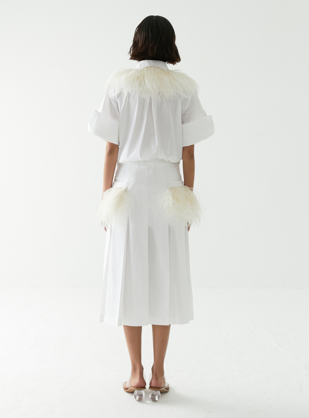 Elevate your everyday edit with this crisp cotton shirt. The detachable feather trim along the collar injects a touch of playful femininity. Tuck it into high-waisted trousers for a polished finish.