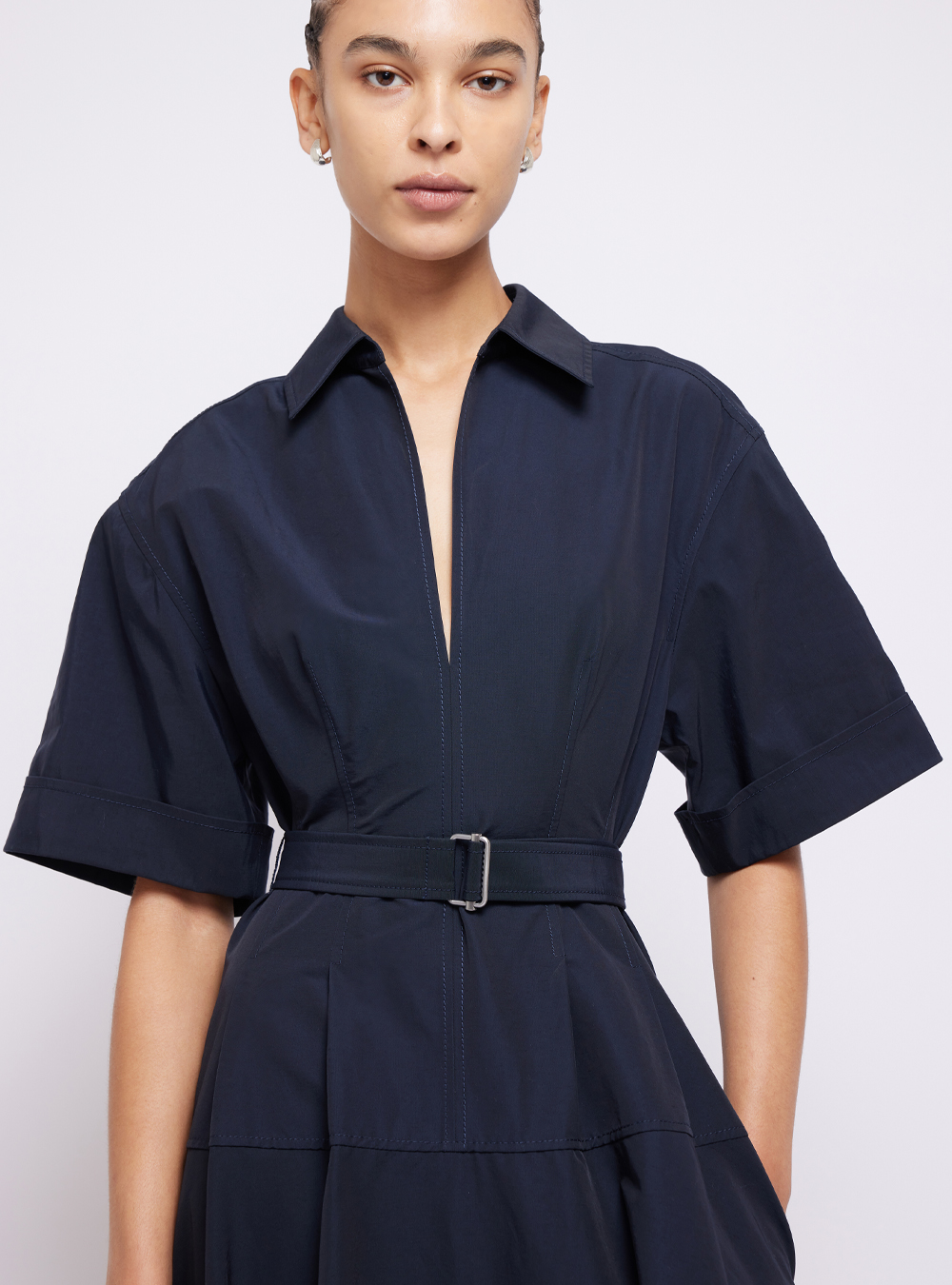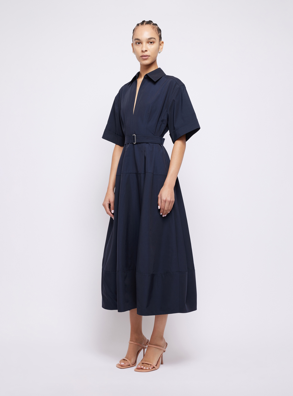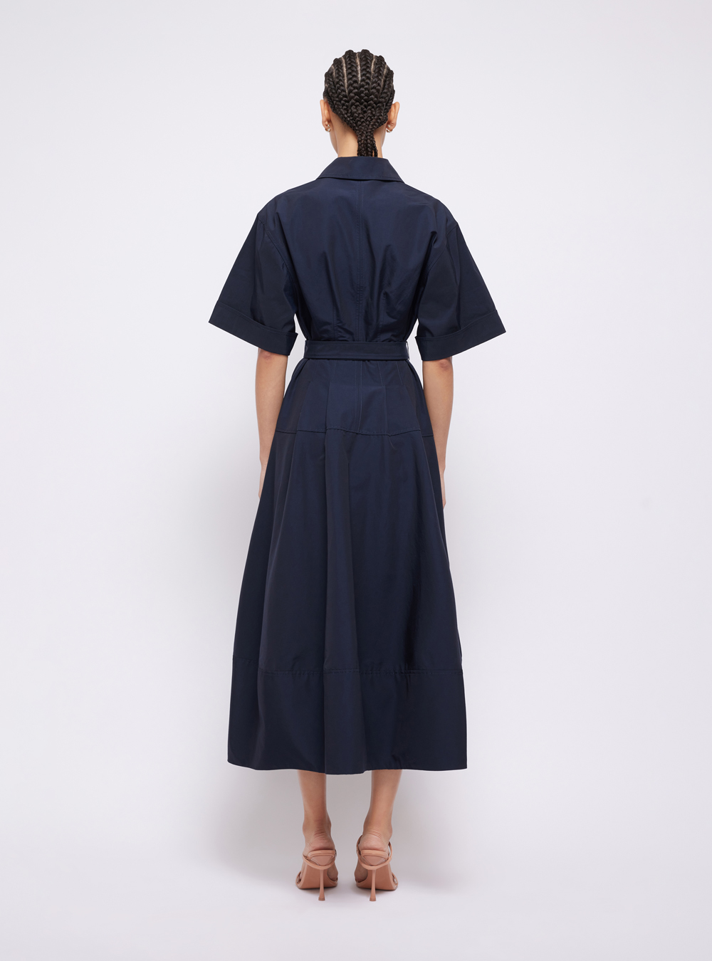 Elevate your wardrobe with the Deanna S/S Belted Midi Dress. Crafted from woven fabric in a midnight hue, this dress offers a flattering silhouette and effortless style. Perfect for any occasion, day or night.