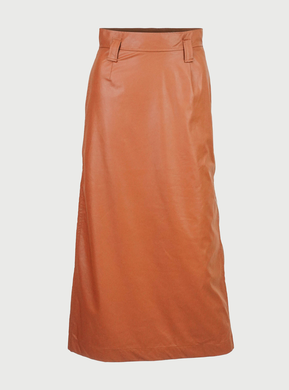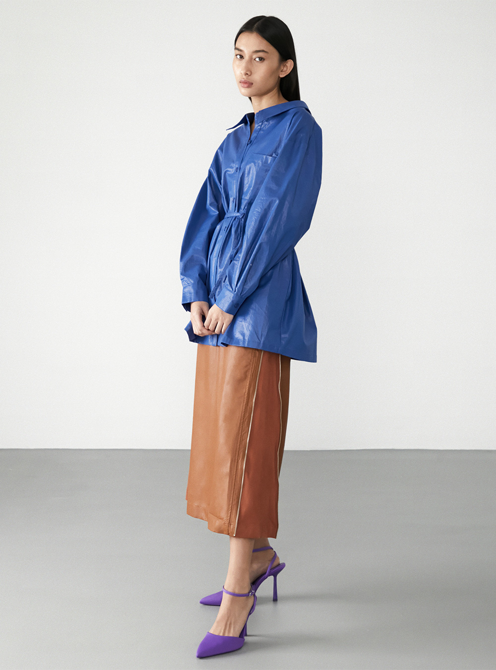 LIE’s FW22 collection invites us to appreciate and encourage the awareness in preserving the beautiful nature through a sustainable lifestyle. The eco-leather zip a-line skirt has a back zip with belt loops. Featuring??zippers on side for expansion, its midi length is perfect for accentuating high-cut boots or footwear.?