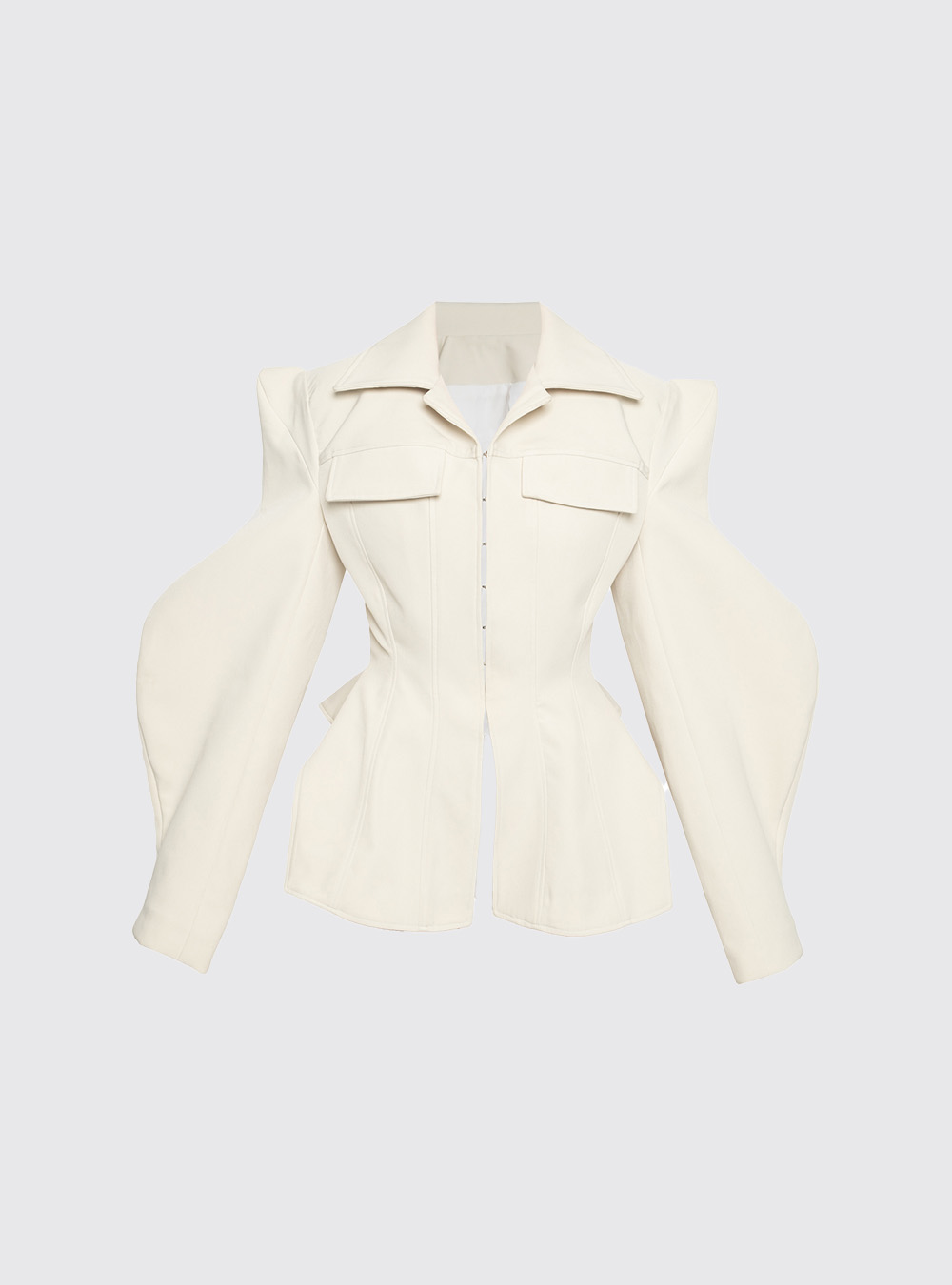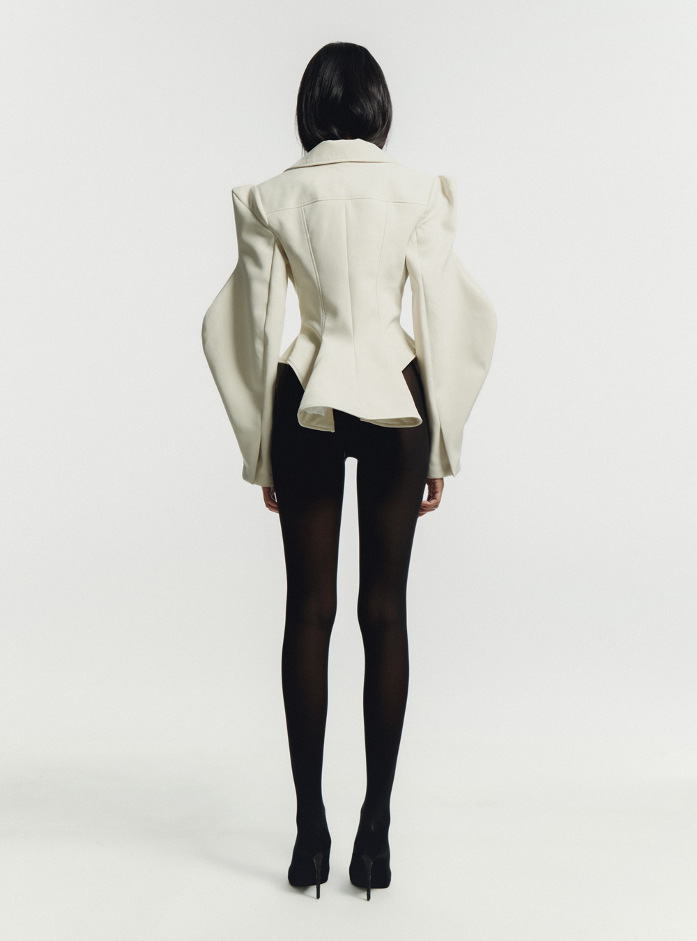 Home » Shop » Egg Shell Tailored Jacket with Abstract Sleeve and Flared Hem