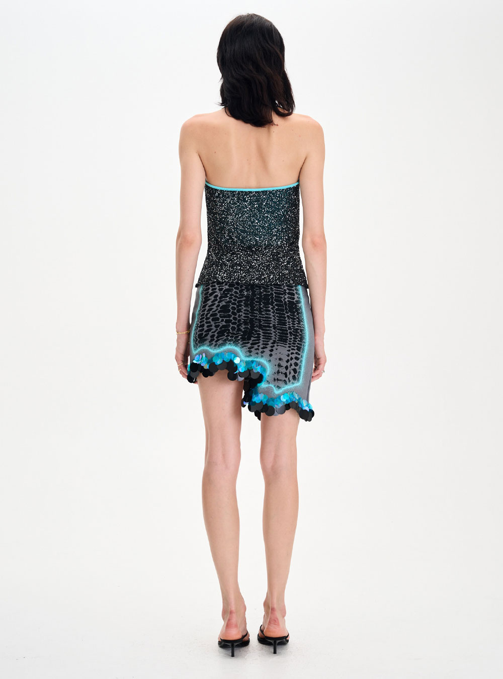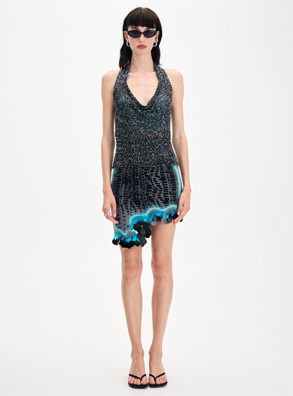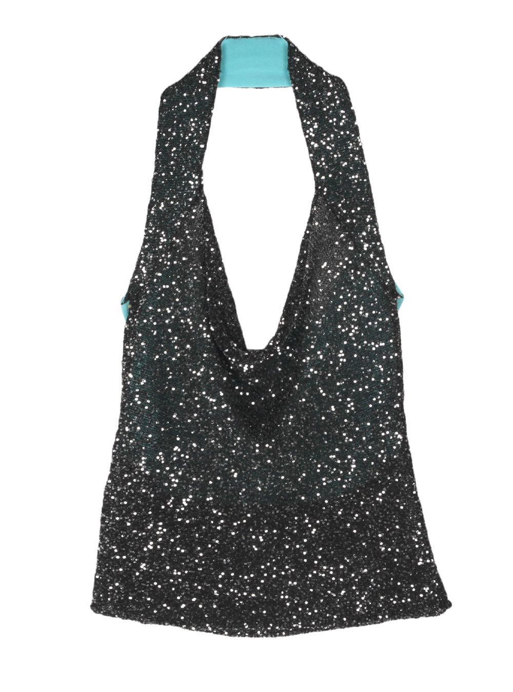 The Elektra Sequins Halter Top is a black, sequined halter top that exudes glamour. Its sleek design and all-over sparkle make it the perfect statement piece for a night out.