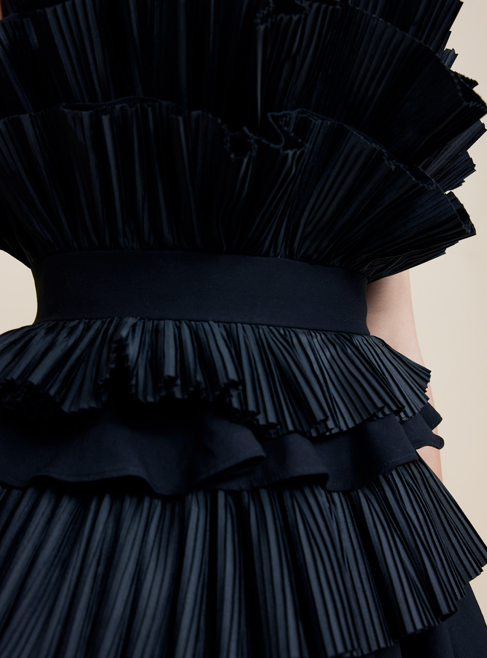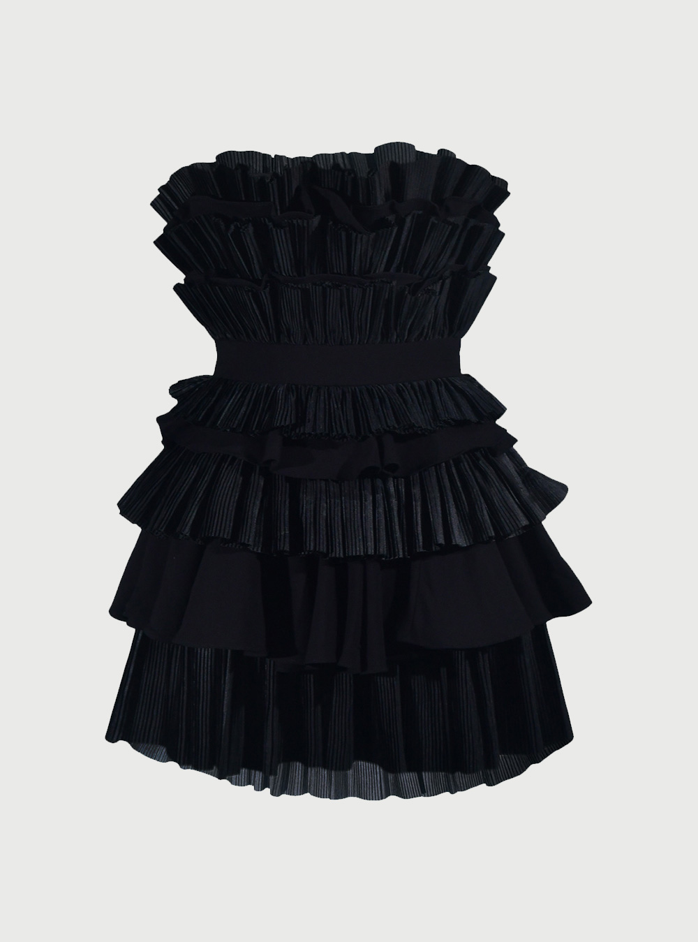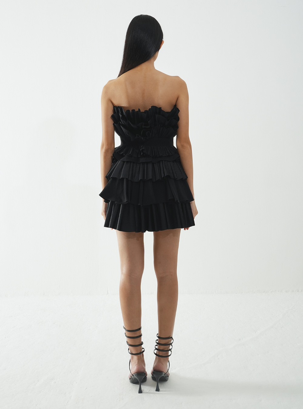 Step out in style into Acler’s Elsher Mini Dress in black, where sculpted ruffles layer this strapless number, cinched at the waist with a harmonious blend of rayon and polyester fabrics.