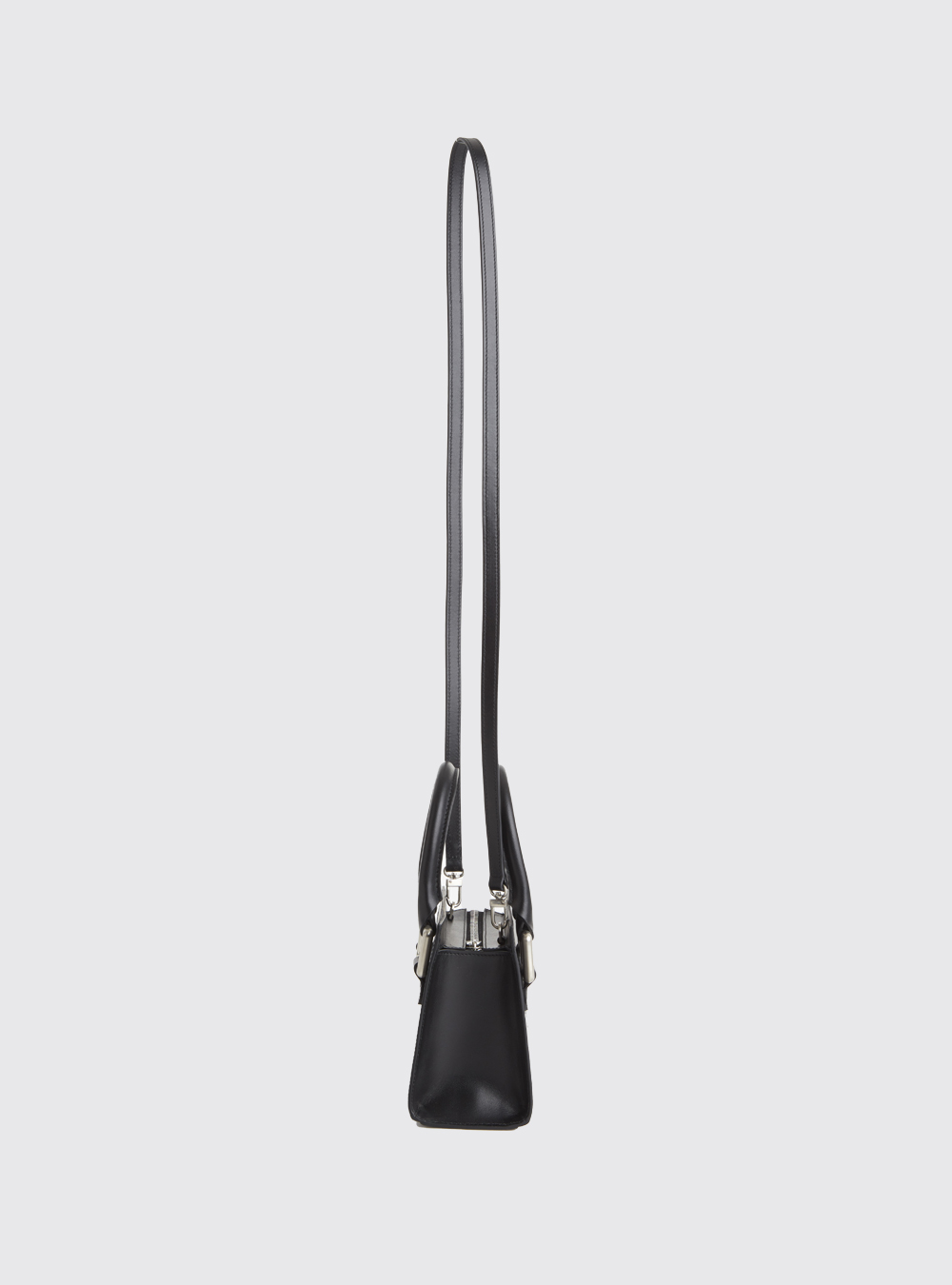 Black leather bag with silver hardware.