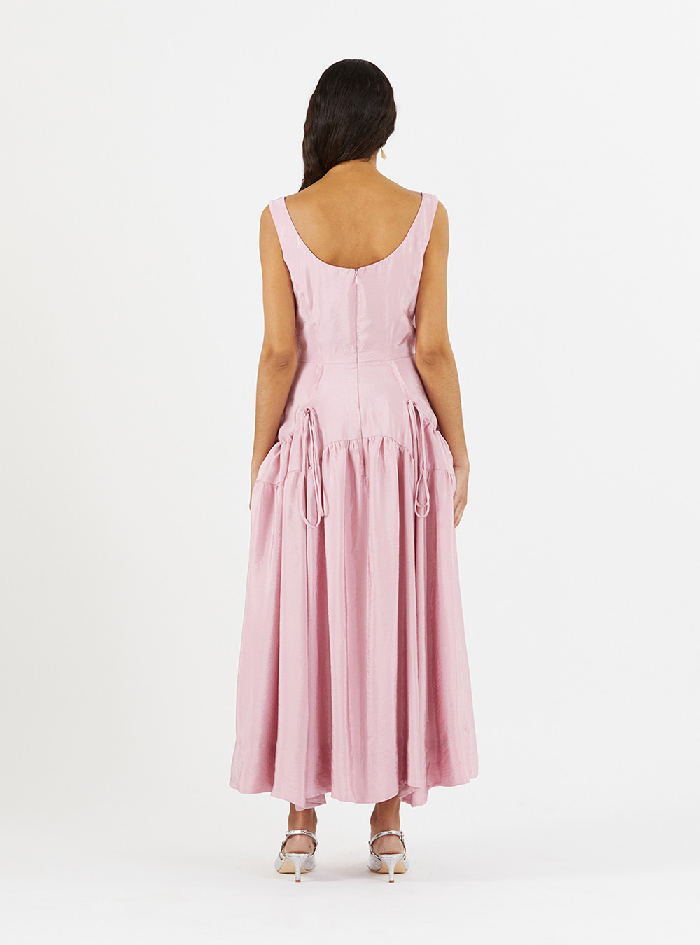 The Rejina Pyo Erica Dress in Viscose Blend Pink is a sleeveless scoop neck midi dress with extended ruched pockets, corseted bodice and ribbon ties.