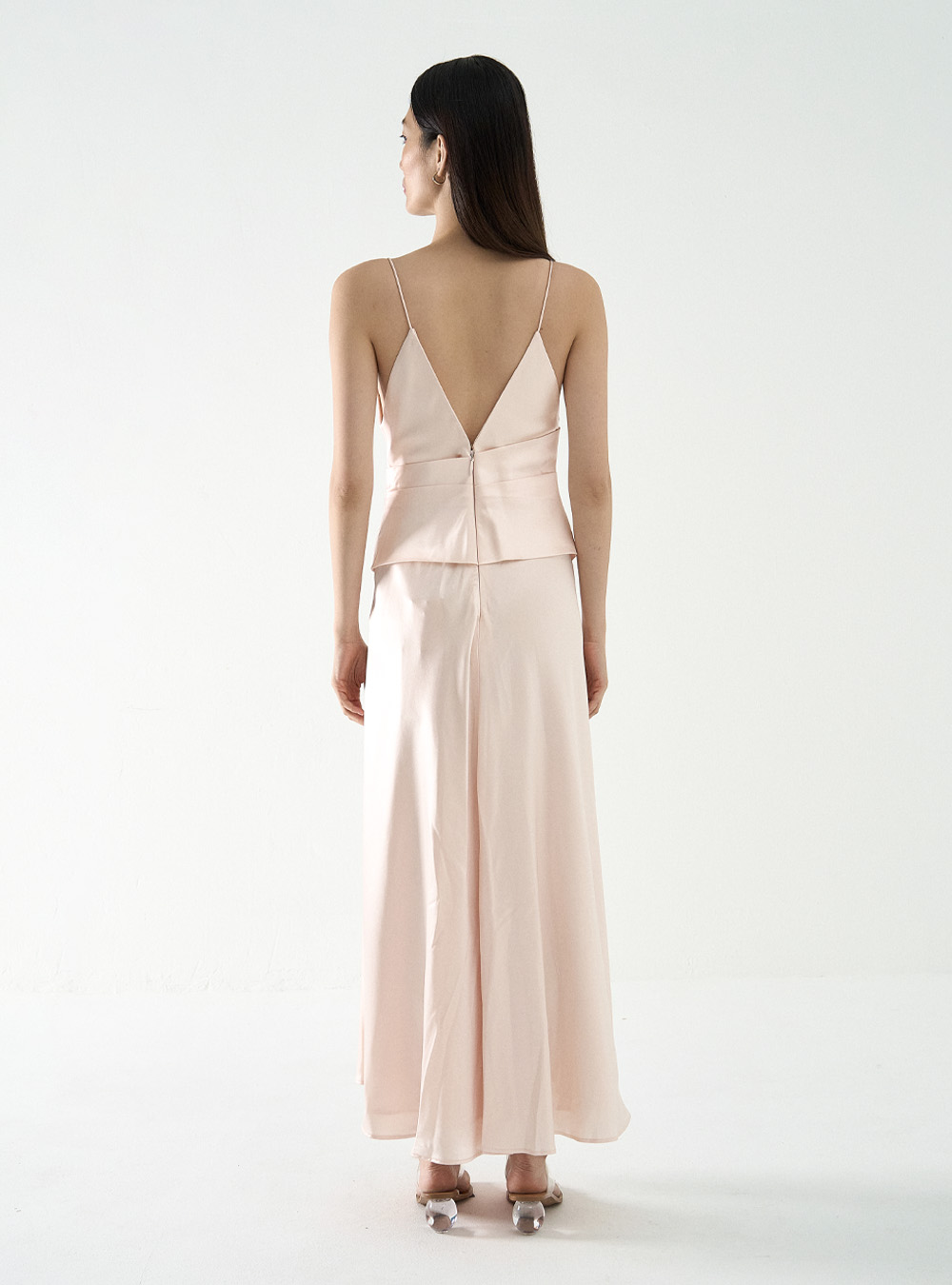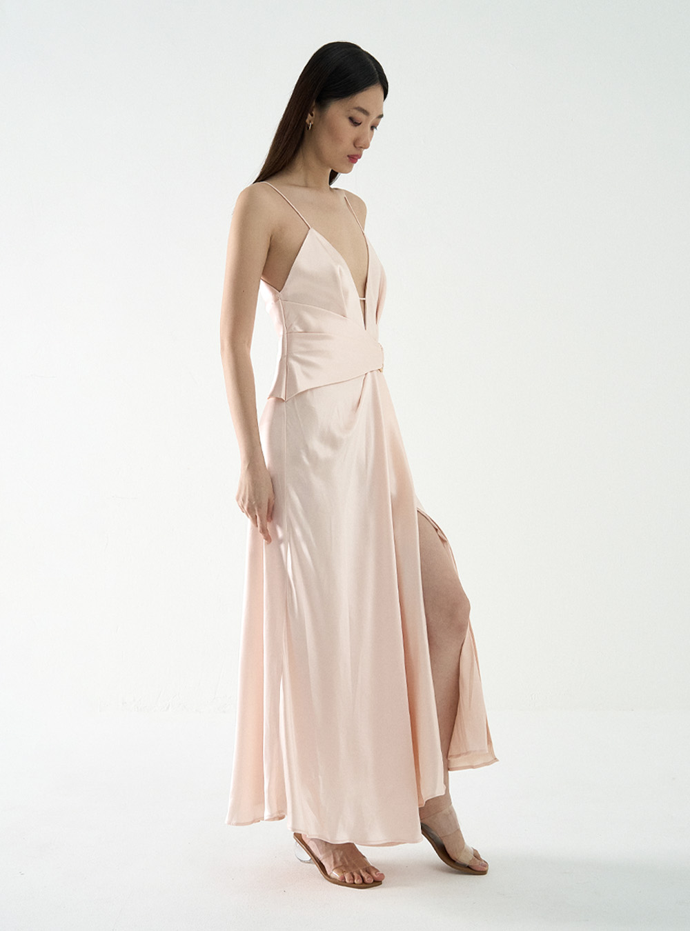Indulge in Acler’s Exton Maxi Dress, a soft pink satin piece that exudes luxury. Gold hardware and delicate thin straps add a layer of opulence to your occasionwear.