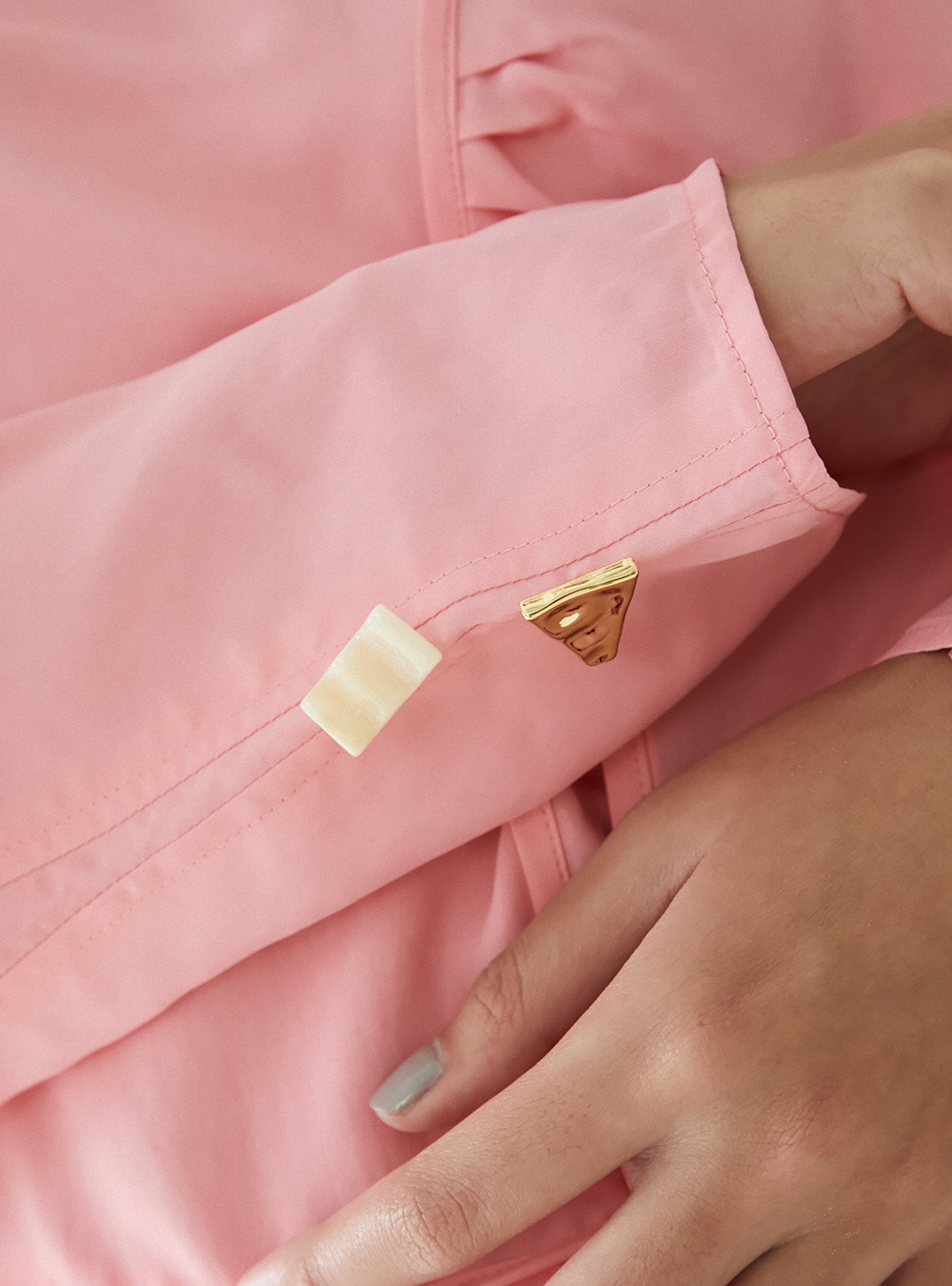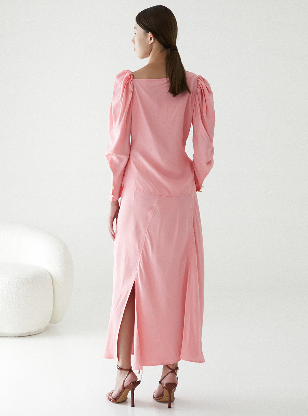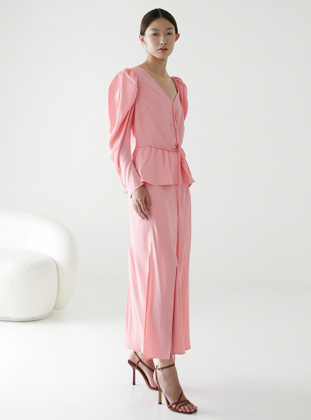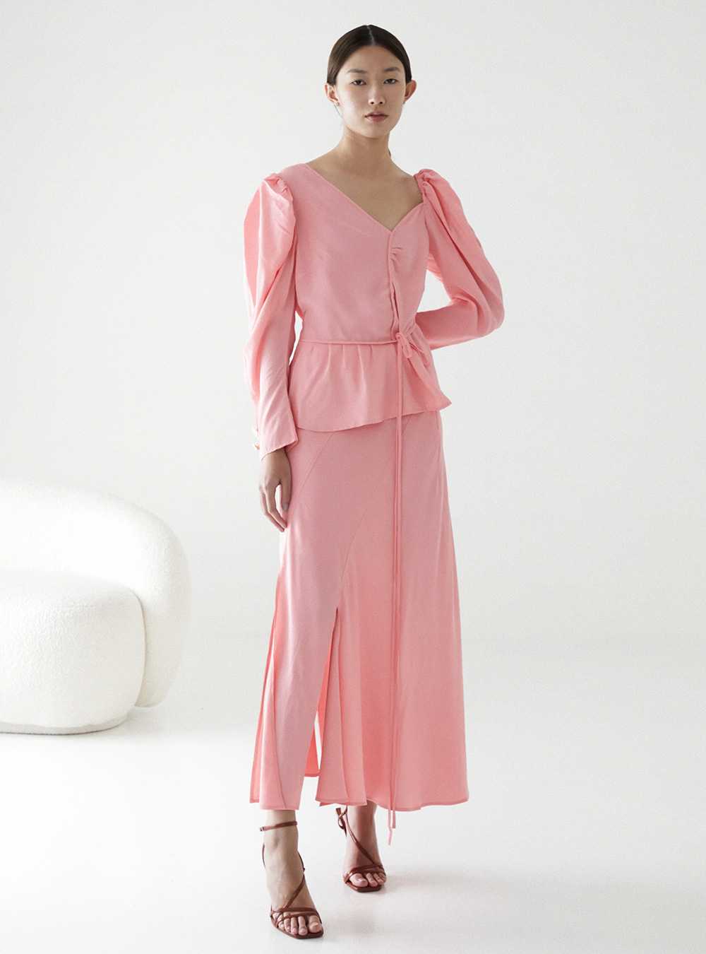 The Rejina Pyo Fiona Blouse in Viscose Pink has an asymmetric silhouette with long puff sleeves, a tie detail to cinch the waist and exaggerated cuffs. Finished with our signature handcrafted buttons.