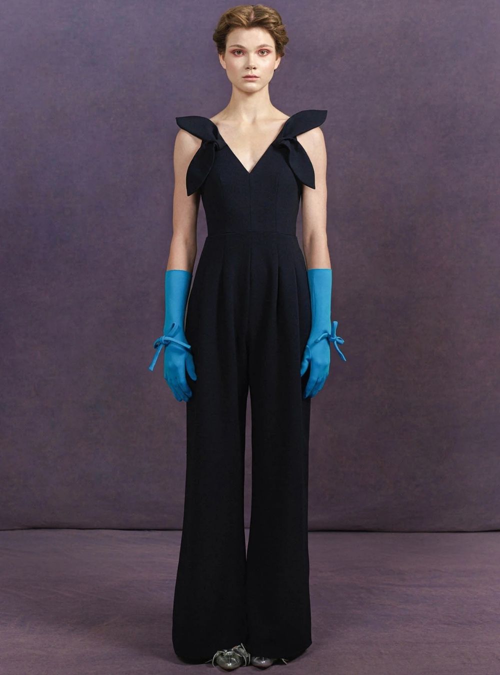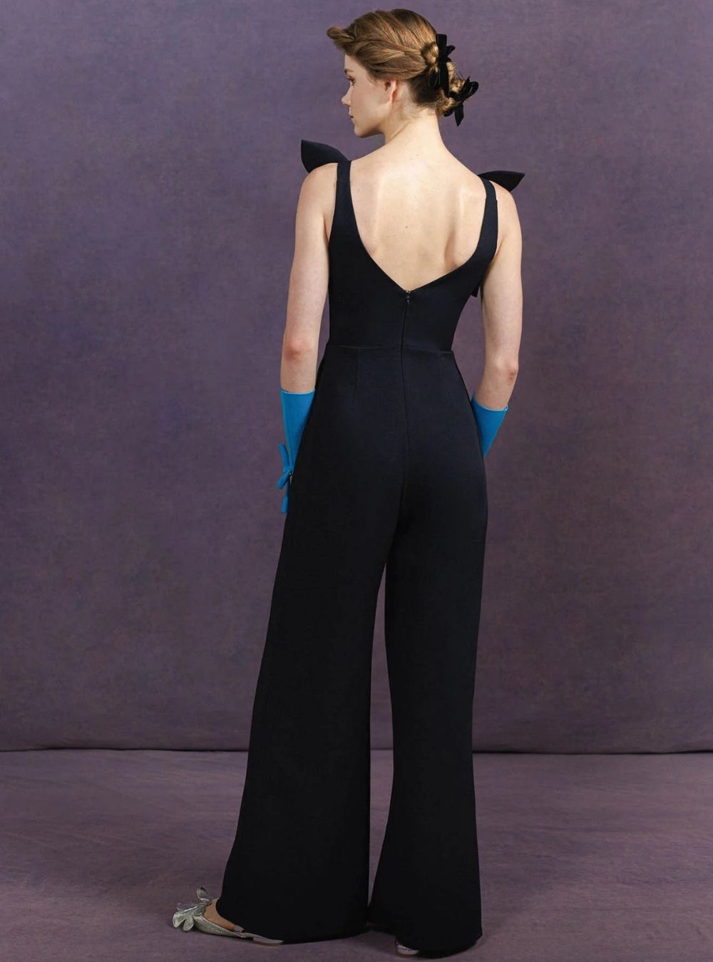 Sleeveless V-neck jumpsuit with a sculpted shoulder detail and wide-leg trousers.