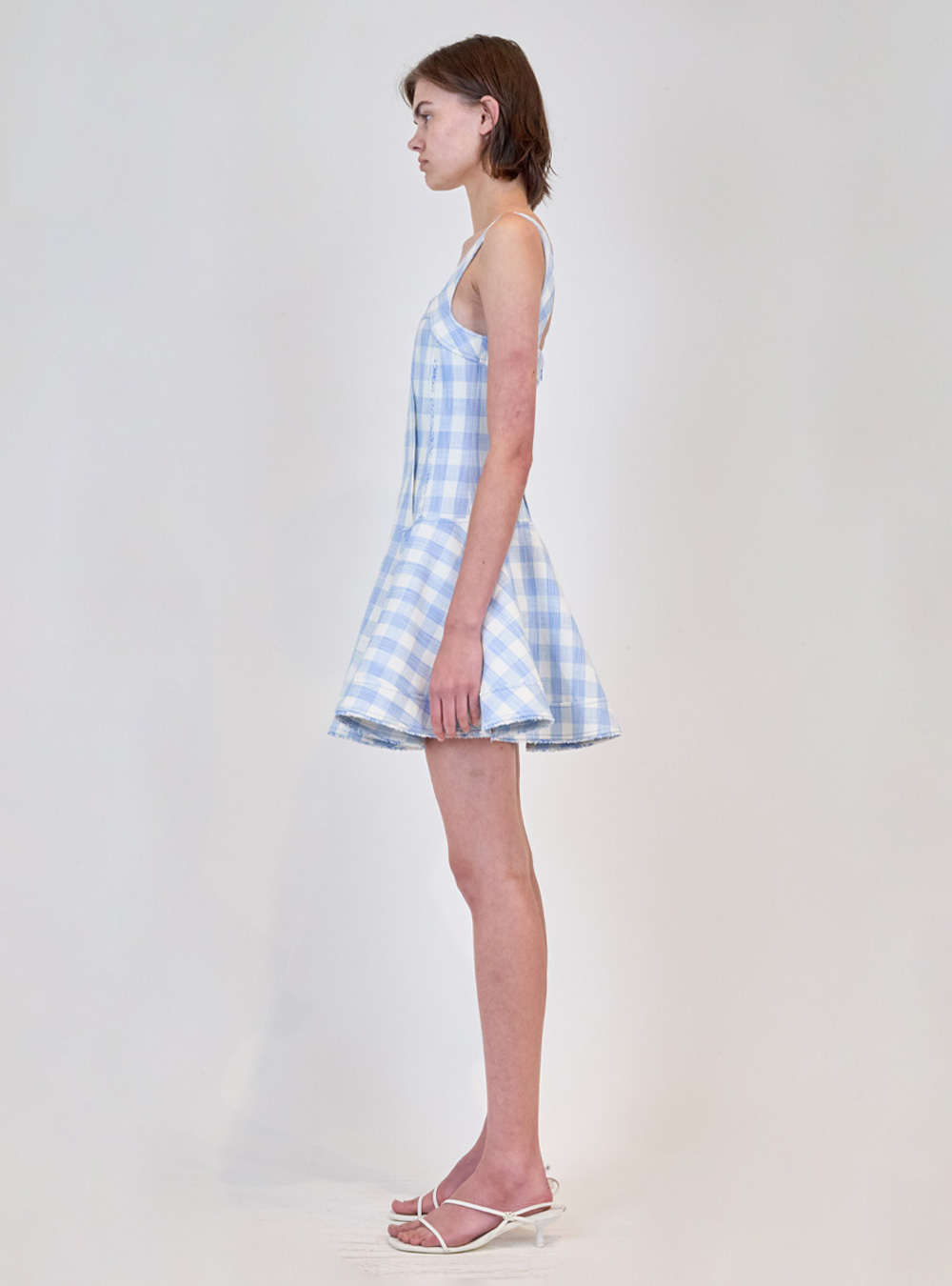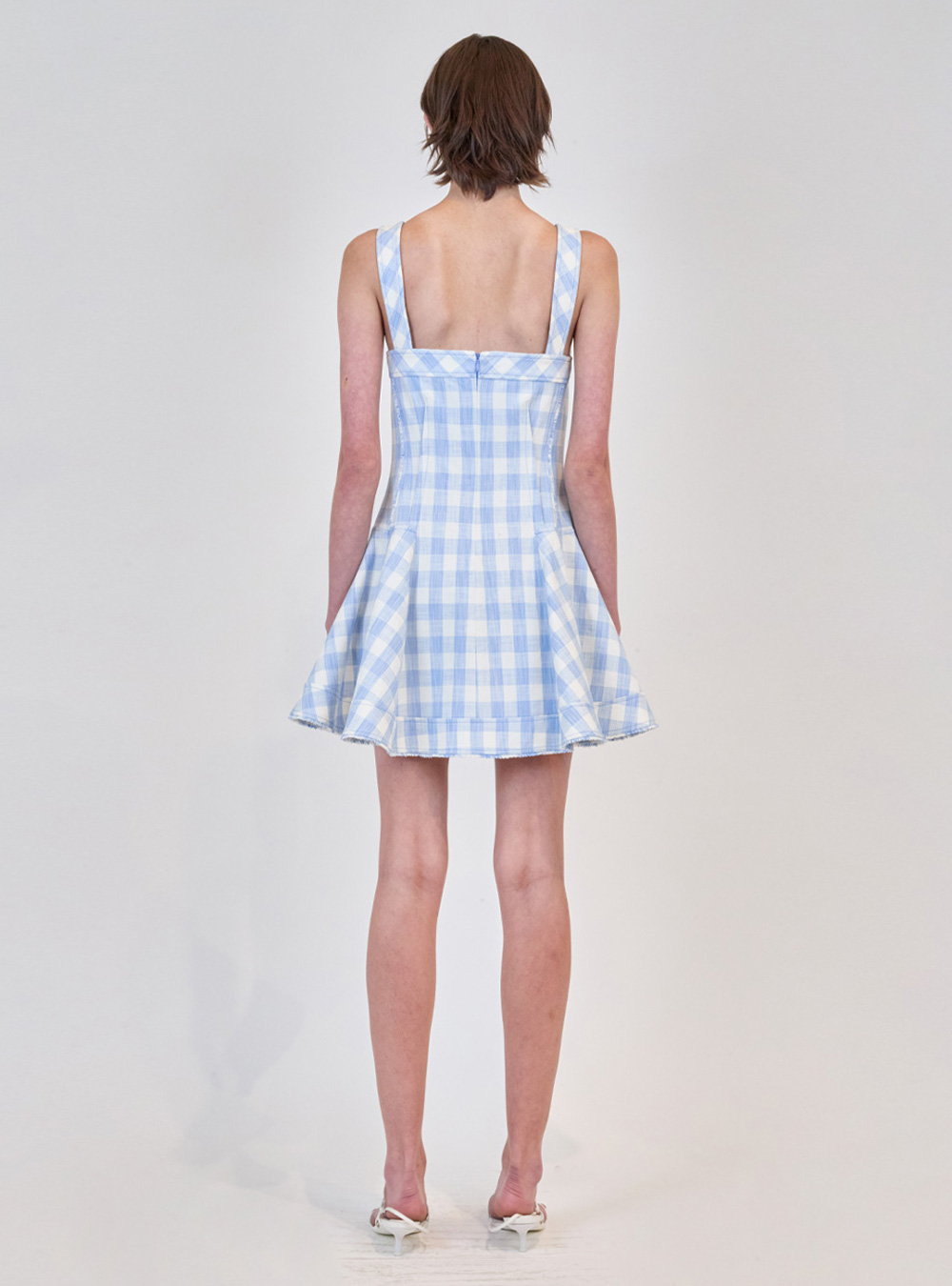 The Hannalie Mini Dress in Blue Hydrangea Gingham. Crafted from yarn-dyed gingham this sleeveless mini showcases a playful yet refined design with impeccable attention to detail.