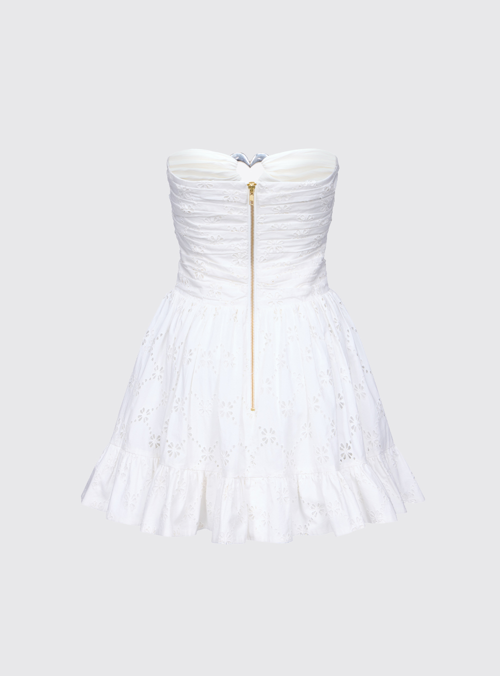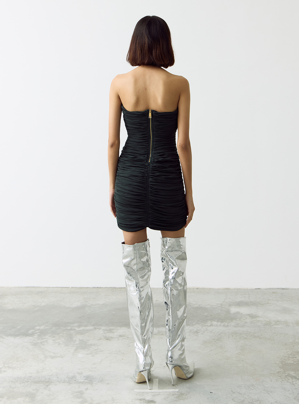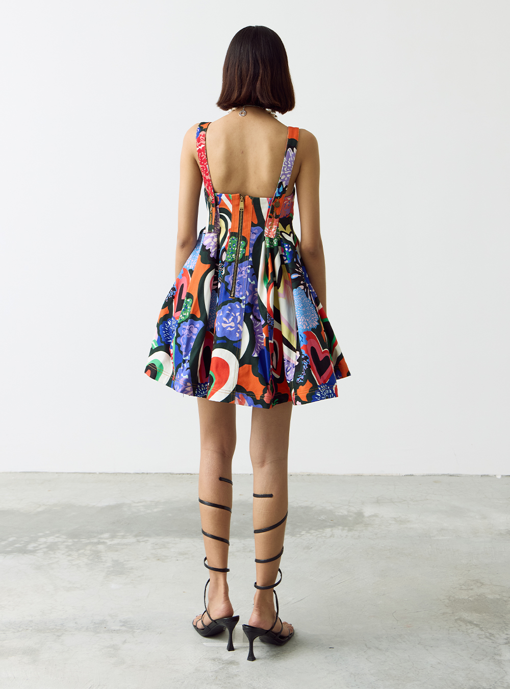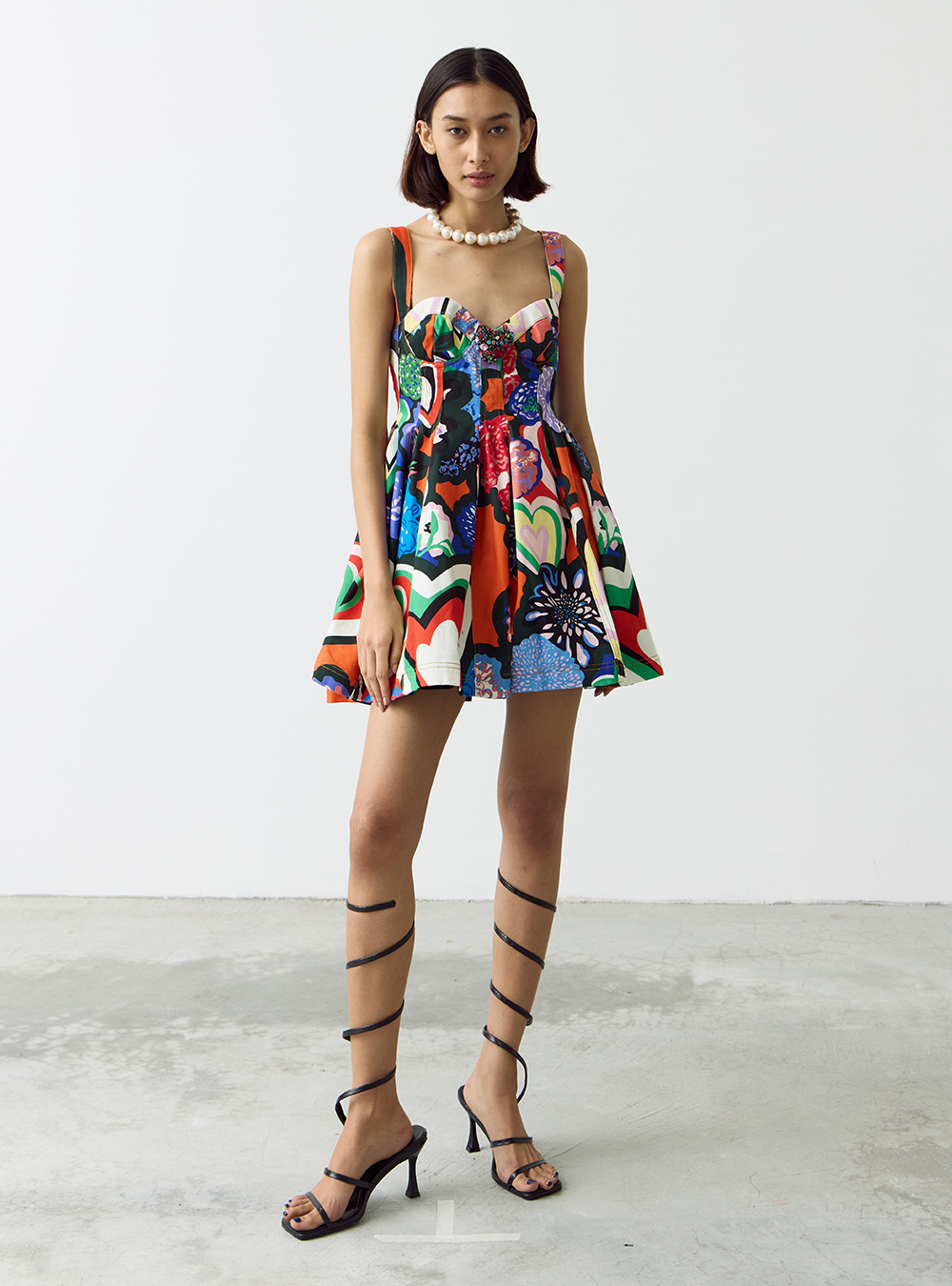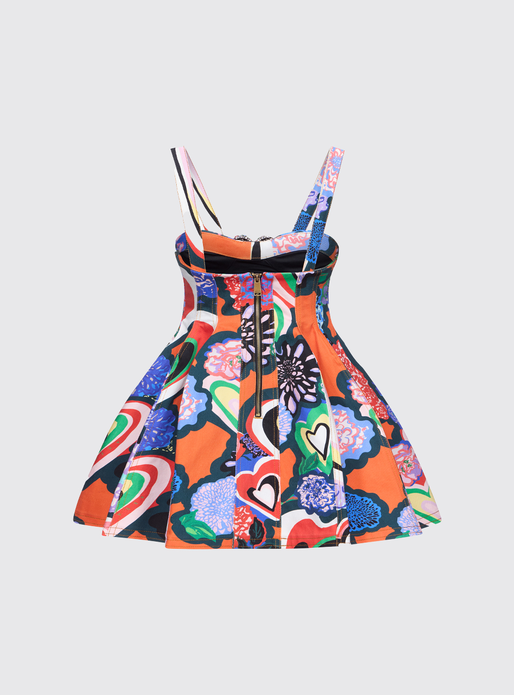 The Heart Printed Godet Mini Dress combines playful charm with a sophisticated edge. The heart print and godet pleats create a fun, flirty look that’s perfect for day or night.