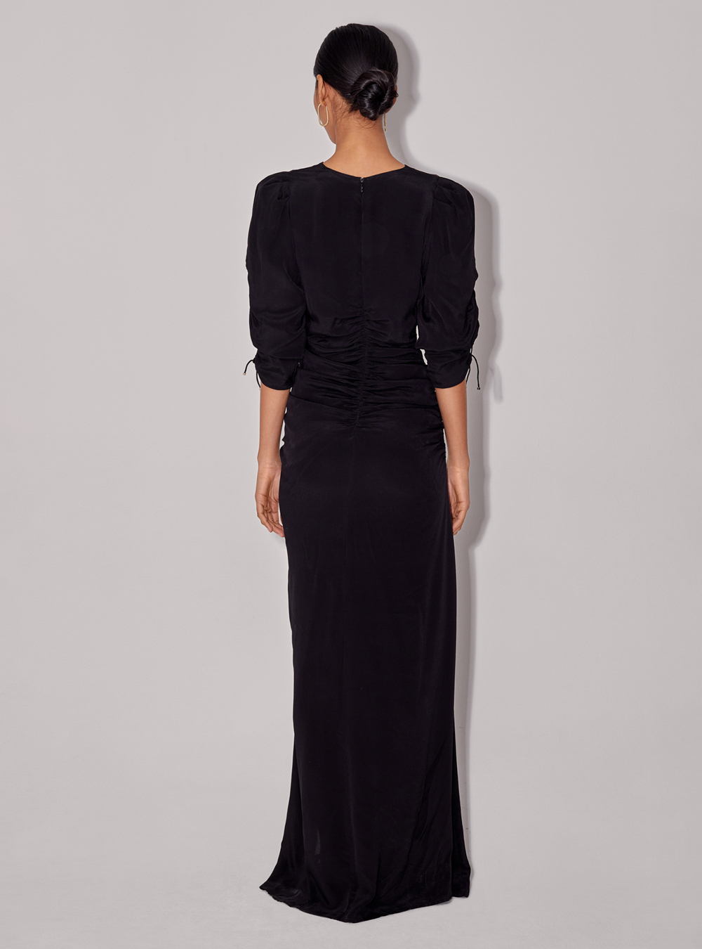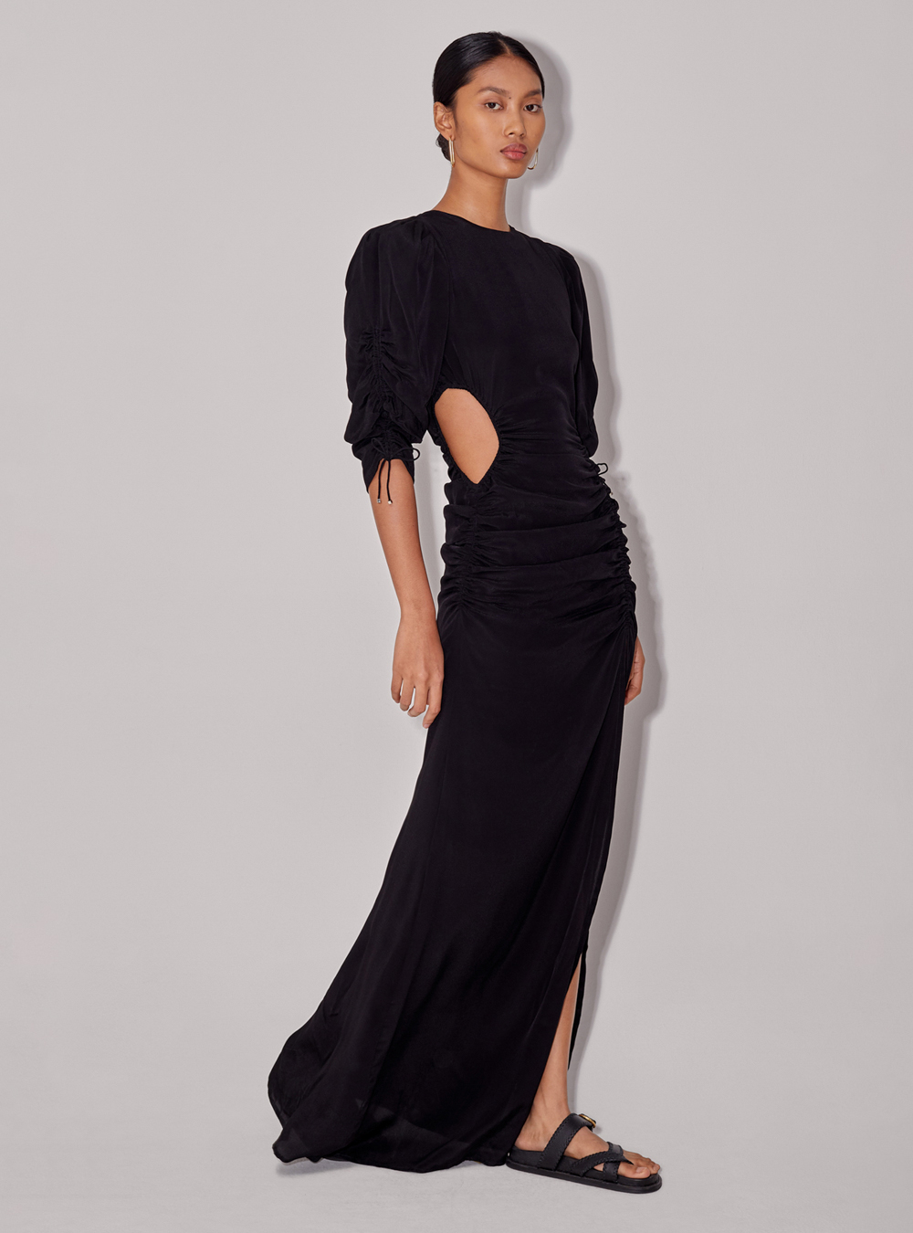The Honore Dress comes in a signature floral print and in a plain black. The maxi length dress features a side cut-out, balloon shoulders, and a dramatic high-cut split.