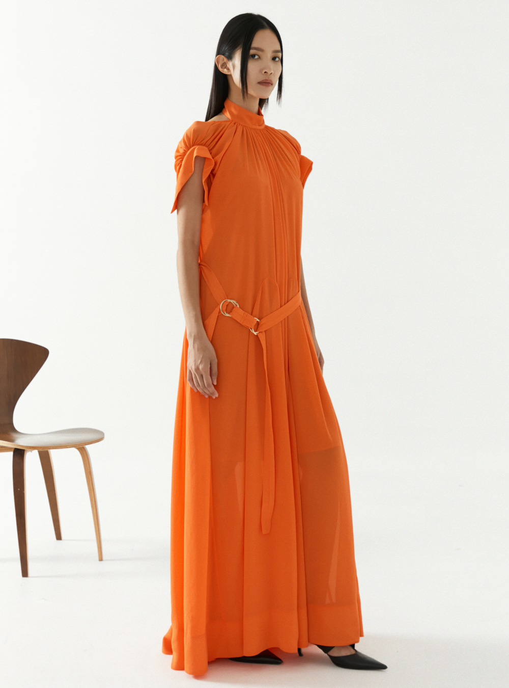 Luxuriate in the subtle yet powerful effect of the Honorine Dress. Its gathered feature on the halter neck collar and exaggerated cap sleeves create a mesmerising effect, while the floor-grazing crinkled chiffon will flatter your figure. Wear yours with colour-matching heels and a bold bracelet for a perfect evening glam look.