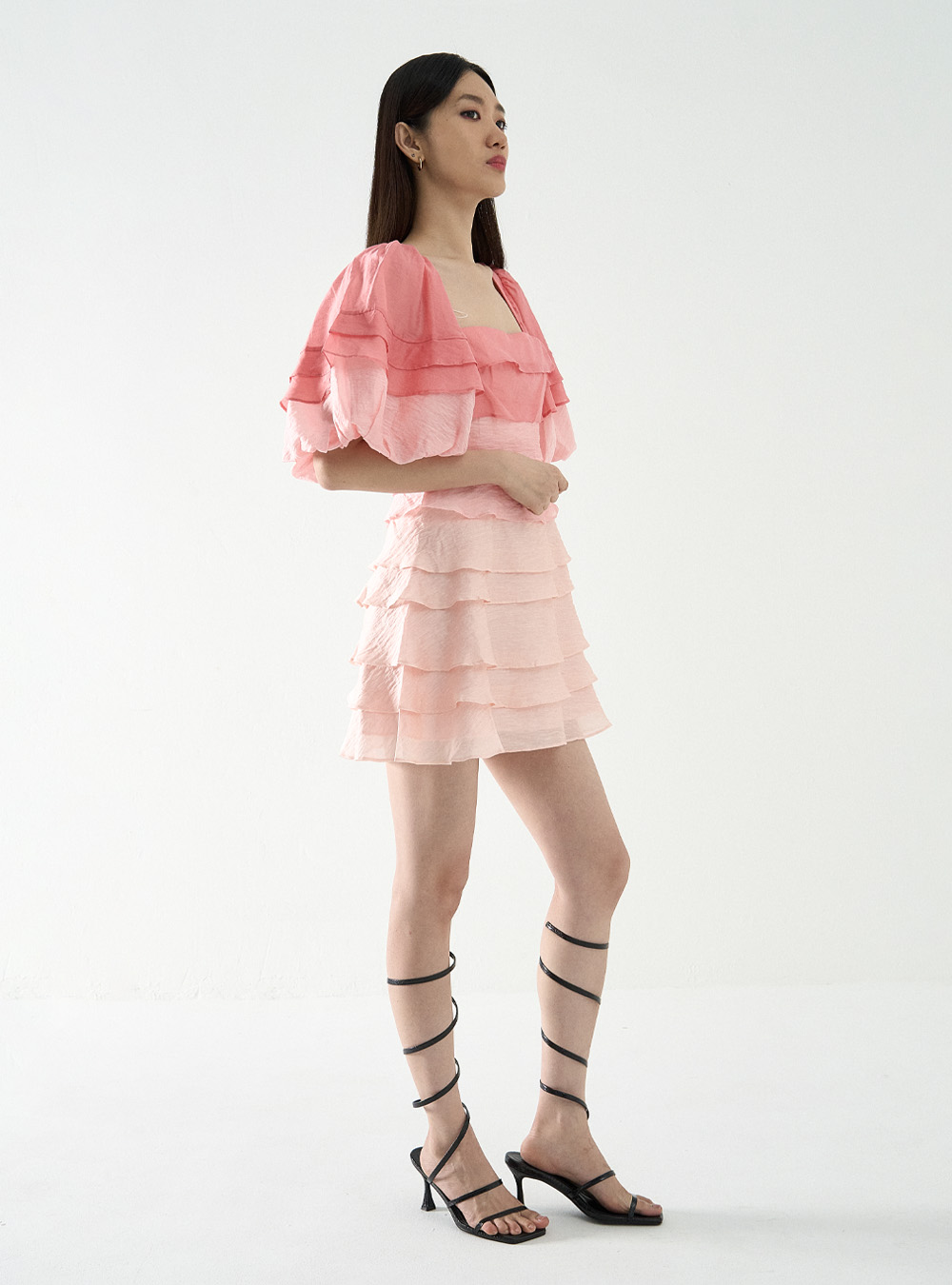 Step out in style with Acler’s Kirton Mini Dress, featuring a pearl pink mix gradient print. Single-layered ruffles create a floaty, babydoll silhouette that encapsulates Acler’s refined craftsmanship.