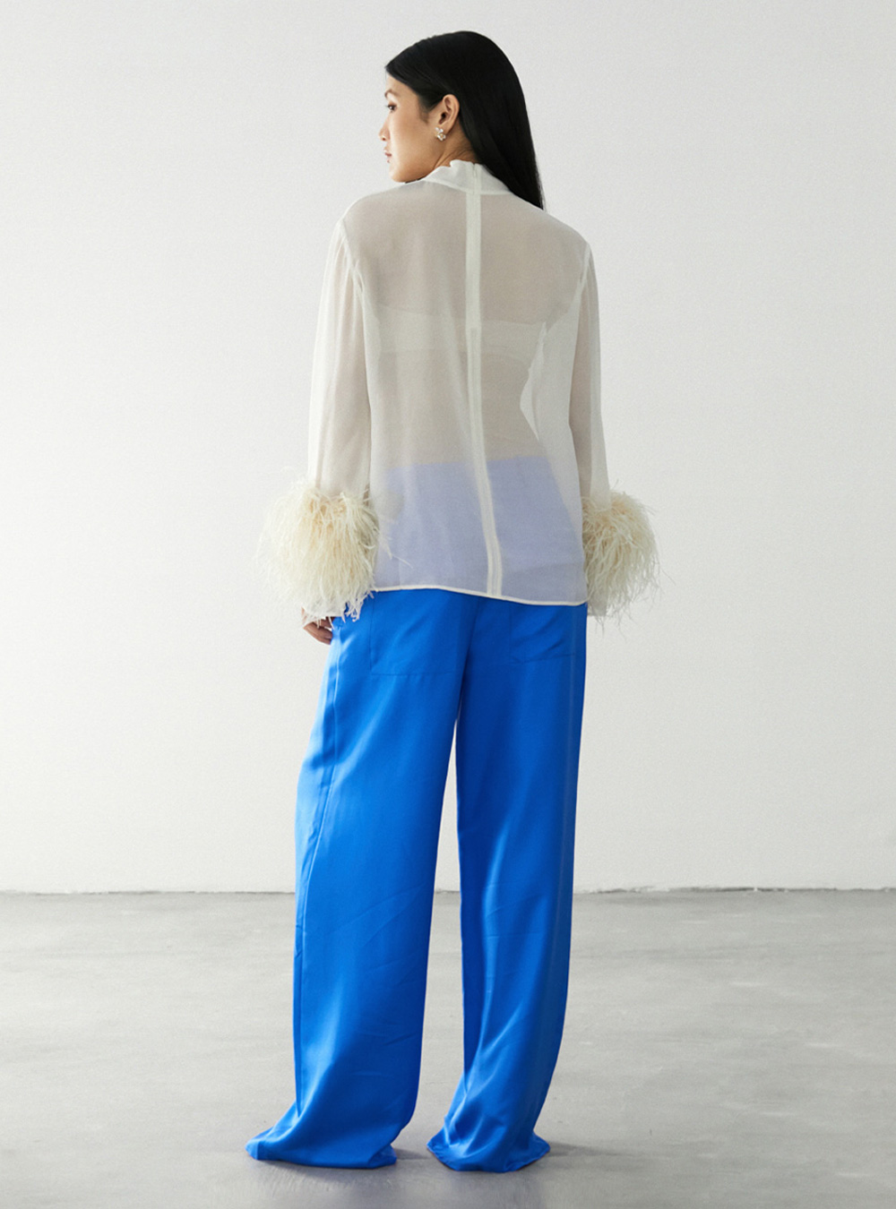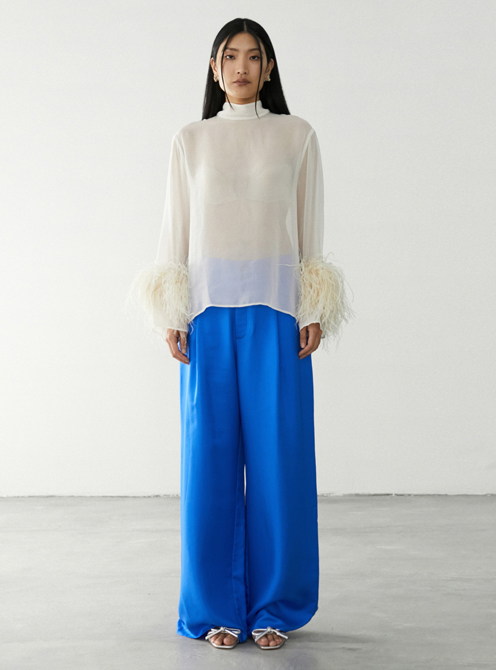 Sheer mock neck top in our lightweight georgette fabrication. Features feathers at the wrists.