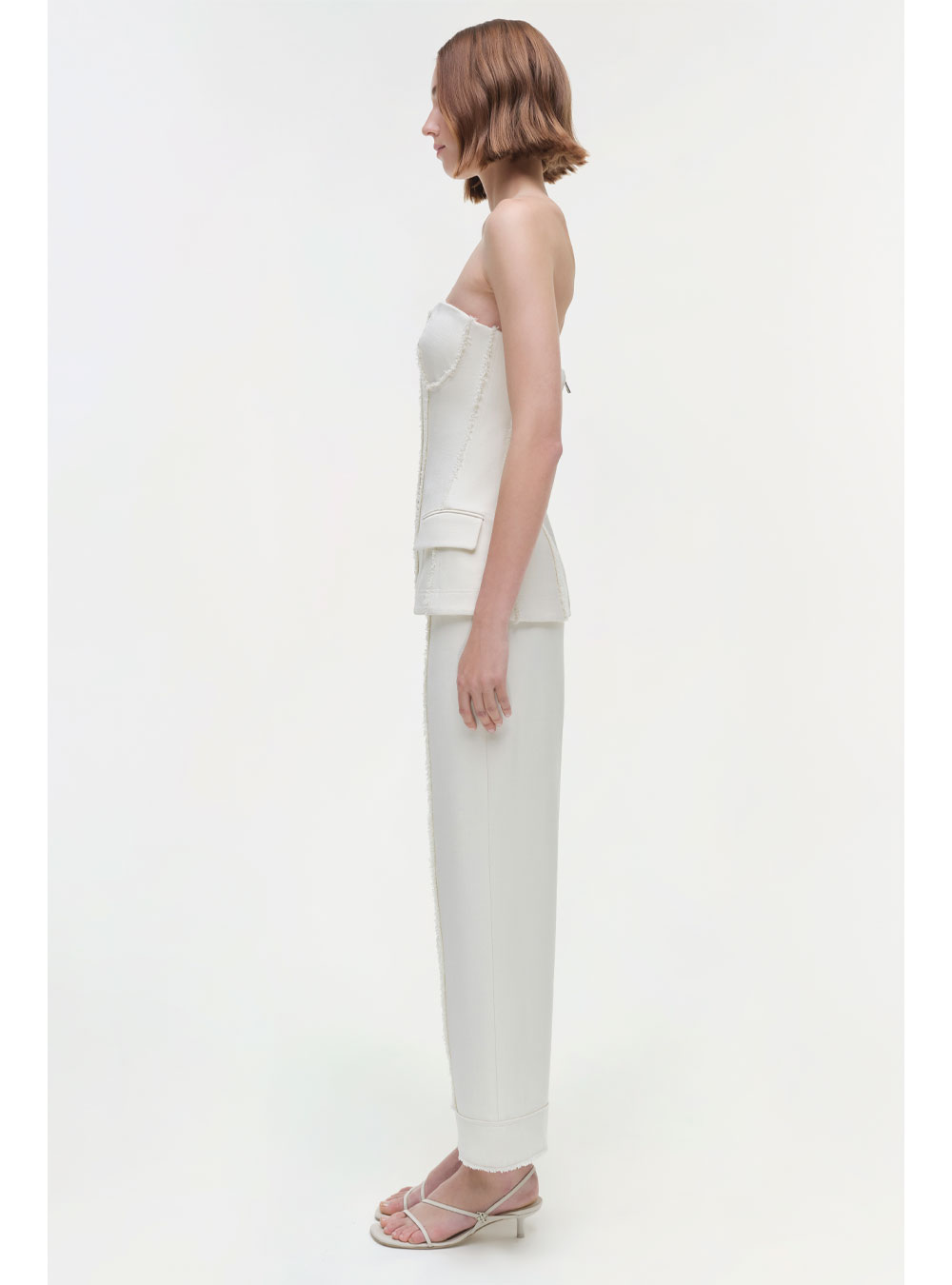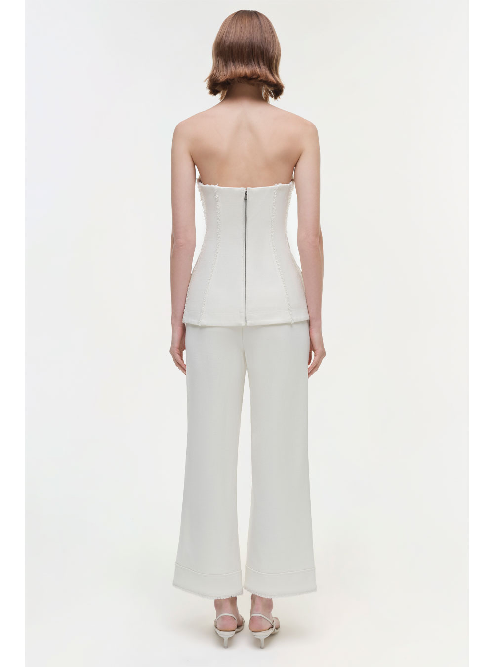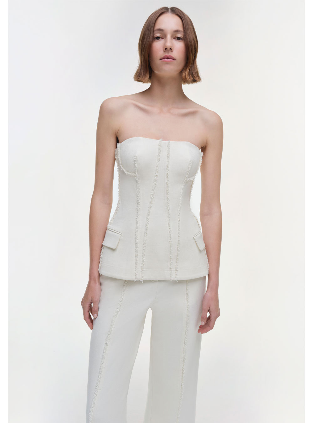 The Lupita Bustier in White. This strapless bustier combines structured elegance with versatile tailoring, making it a refined choice for both day and night looks.