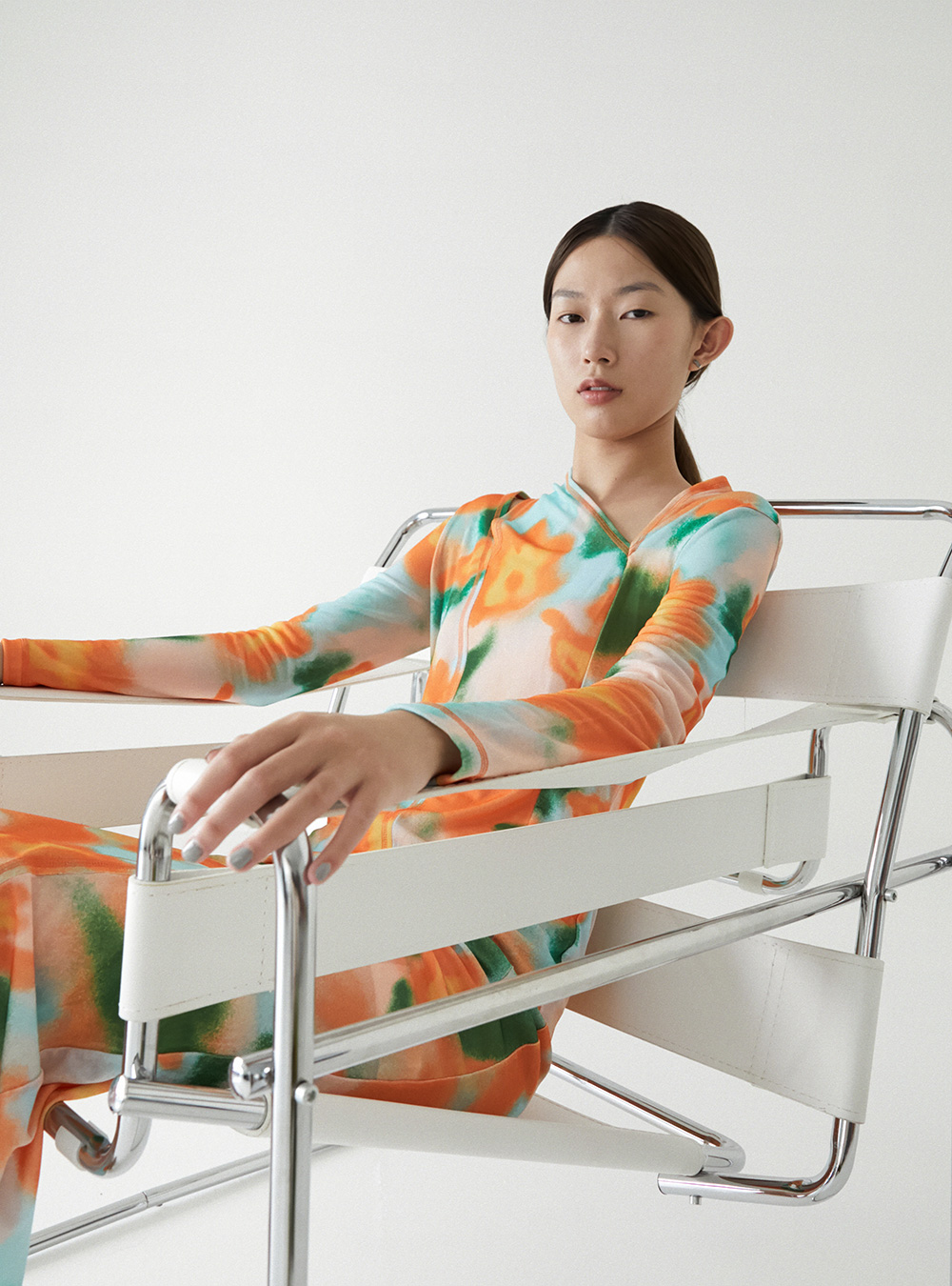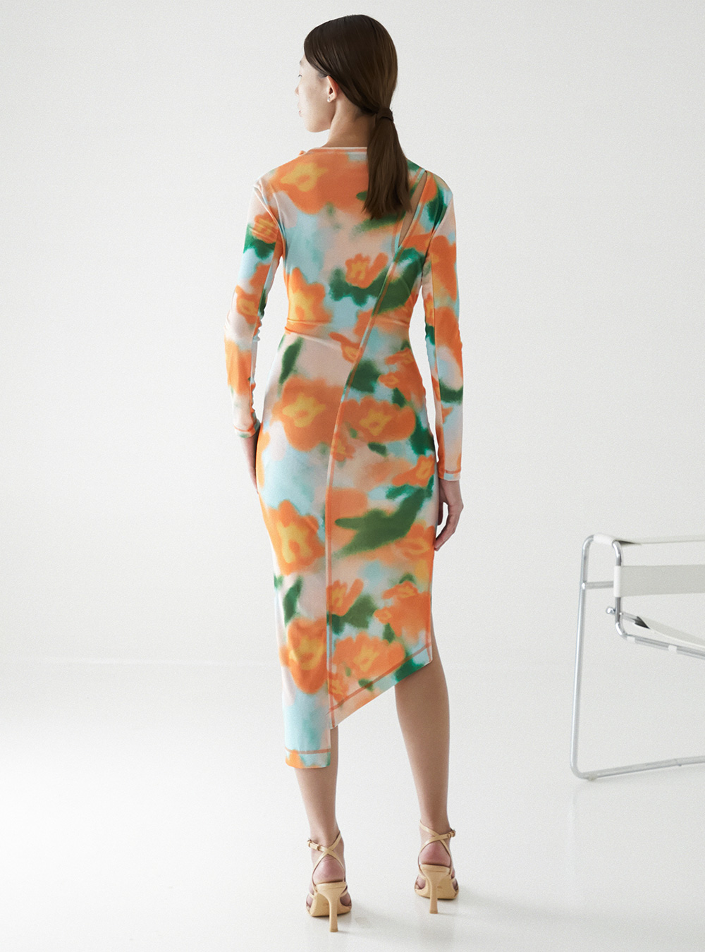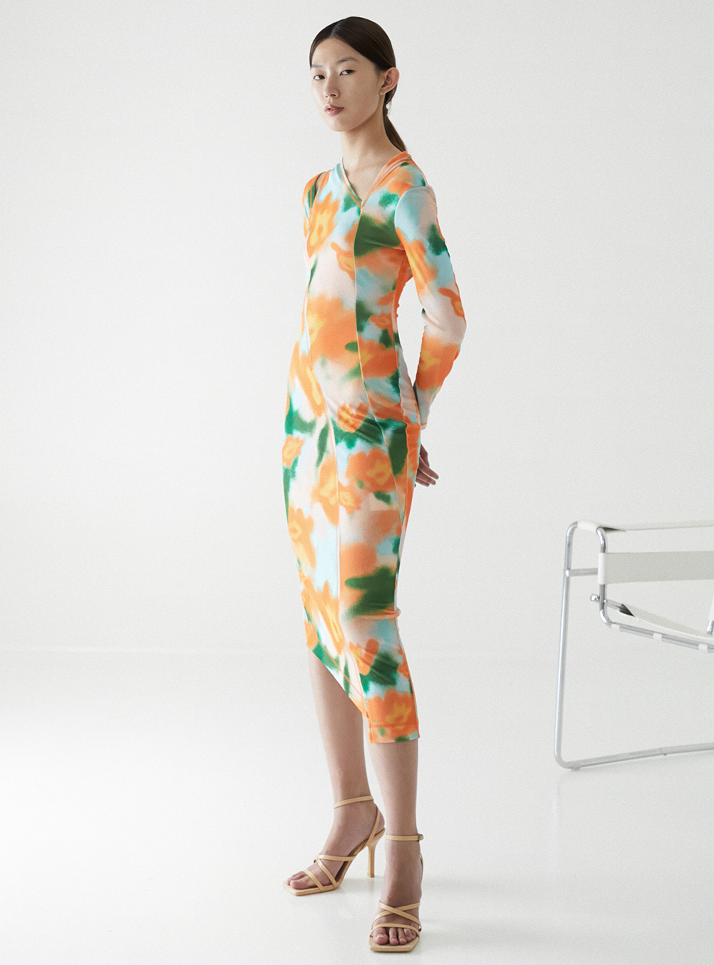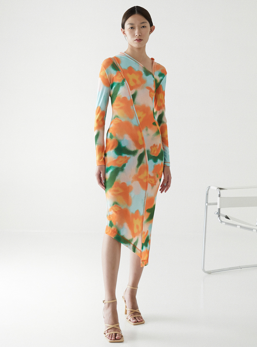 As seen in the PF22 Lookbook, the Rejina Pyo Mavis Dress in Jersey Print Flower Orange is a long-sleeved dress with an asymmetric hem, featuring a shoulder cut-out and contrast stitch detailing. Designed to a close fit with plenty of stretch.