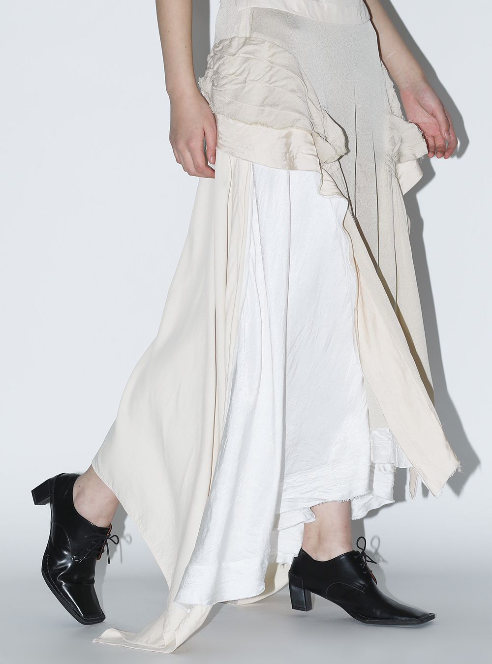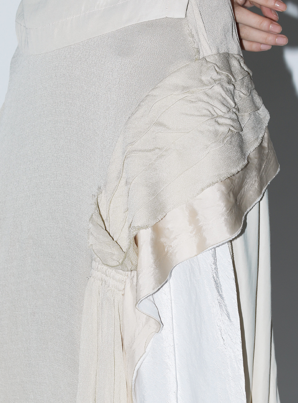 A flowy layered skirt made from mixed media with muted hues and details that is simple and elegant.