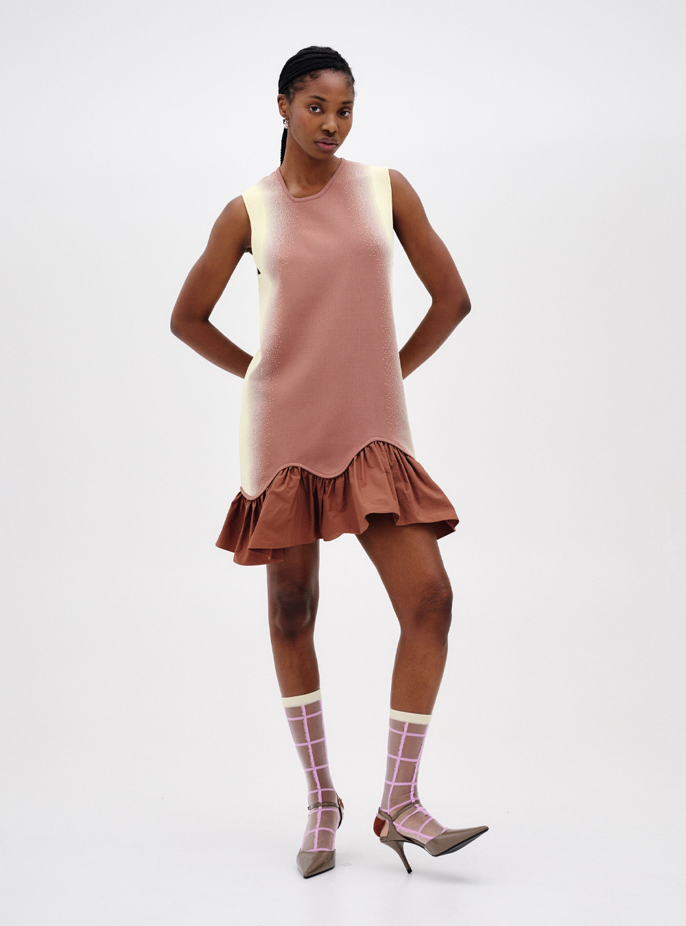 Windswept and whimsical best encapsulate PH5’s Fall/Winter 2024 collection. Birthed from the idea of a humble scarf, creative director Zoe Champion weaves a narrative rooted in her familial past—having learned how to knit one from her grandmother. Designs play with texture and draping to emulate the movement of tossing a scarf over one’s shoulder and how it moves in the wind. For this season, the label’s signature gradient jacquard is presented in high-octane variations—black-and-white, electric blue and brown-and-pink.