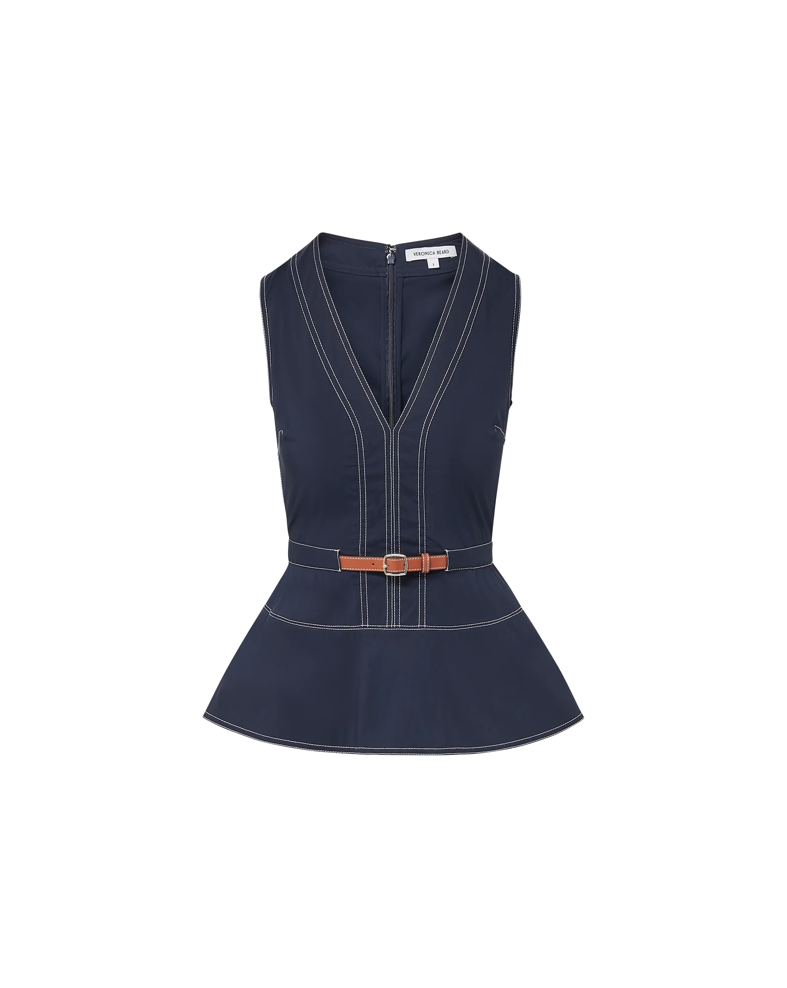 Your new go-to for going from the office to dinner out. The Nickleby sleeveless top is designed to flatter, featuring a deep V-cut neckline and a built-in belt that cinches the waist before flowing into a peplum hem. Crafted from a premium stretch-cotton blend in navy, it’s finished with white topstitching details. Pair this peplum top with everything from wide-leg denim to skinny trousers.