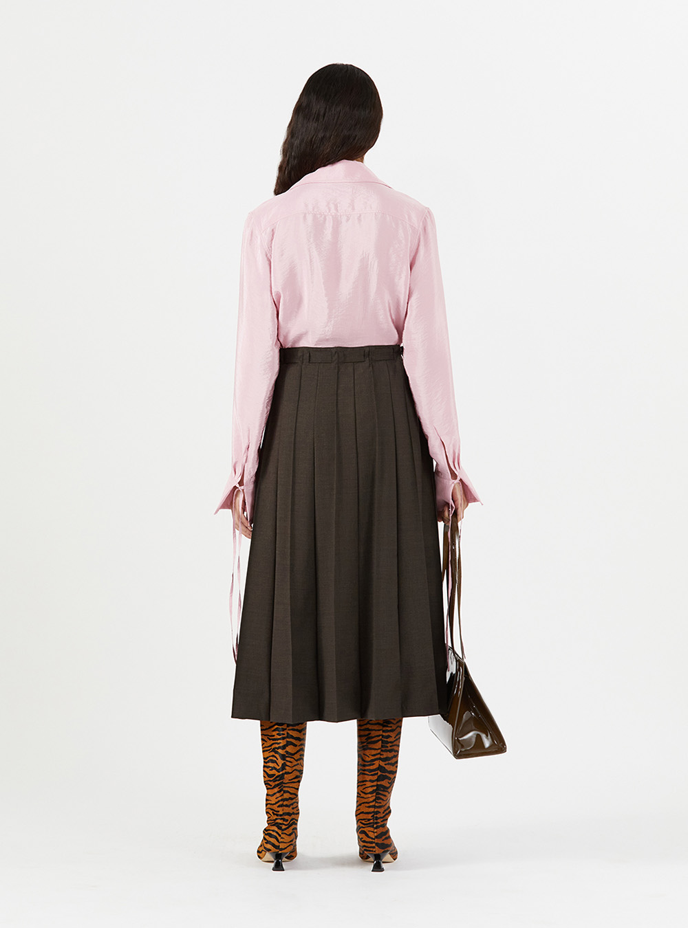 The Rejina Pyo Noor Skirt in Wool Blend Suiting Coffee is a mid length pleated skirt with gold plated buttons.