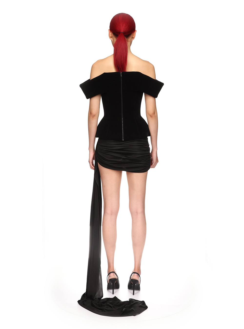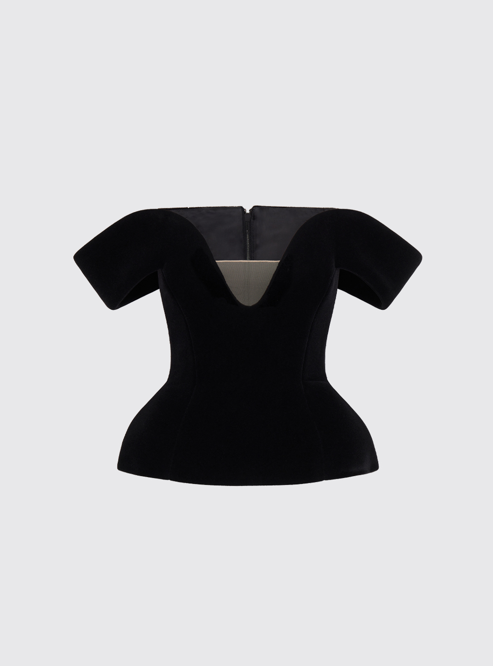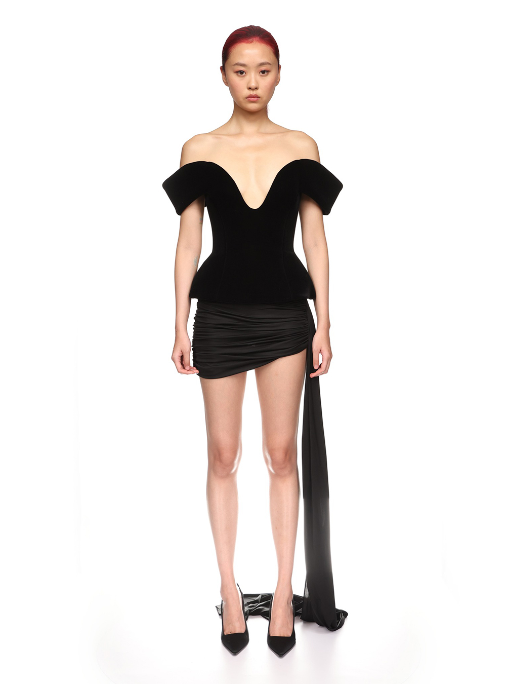 The Off Shoulder Structured Velvet Mini Dress exudes effortless elegance with its off-the-shoulder wave neckline, accentuated by a delicate cream tulle insert at the bust. A discreet zip closure at the back ensures a flawless fit for a glam night out.