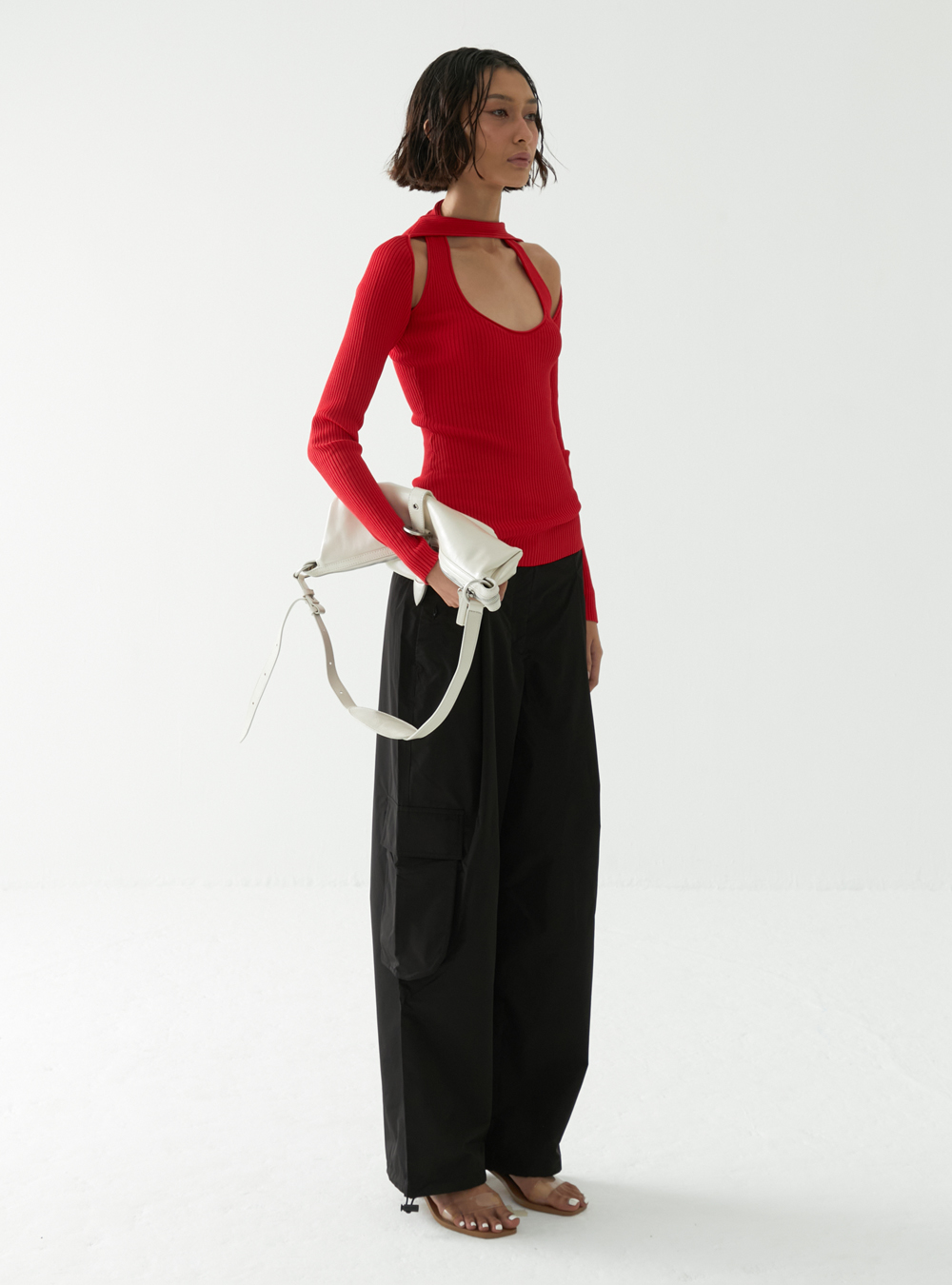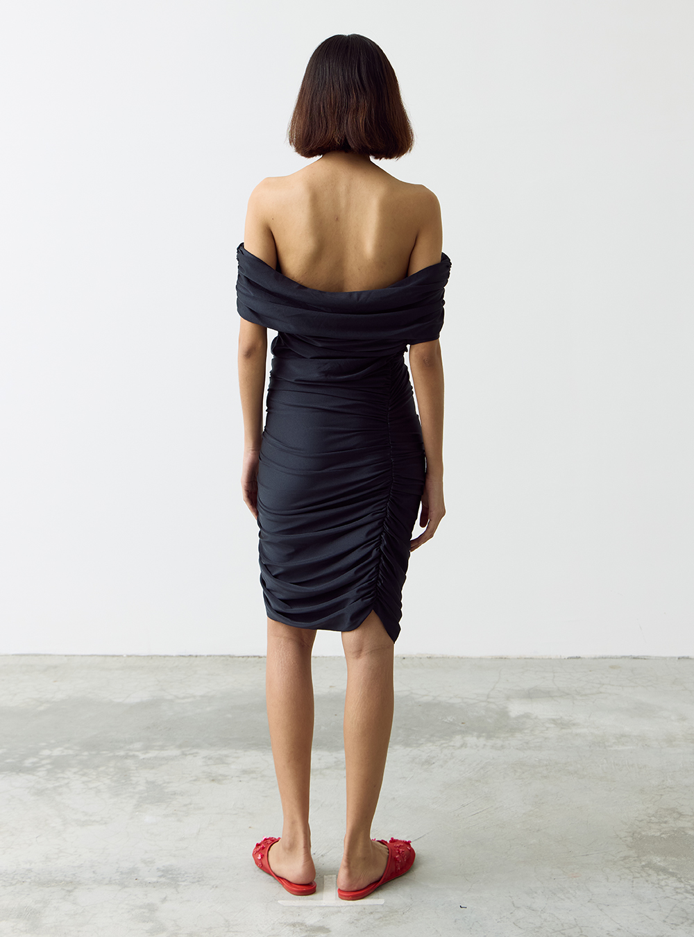 The Off-Shoulder Taffeta Top is a highly tactile and textured top with a ruched bodice that adds a muted detail to the look.