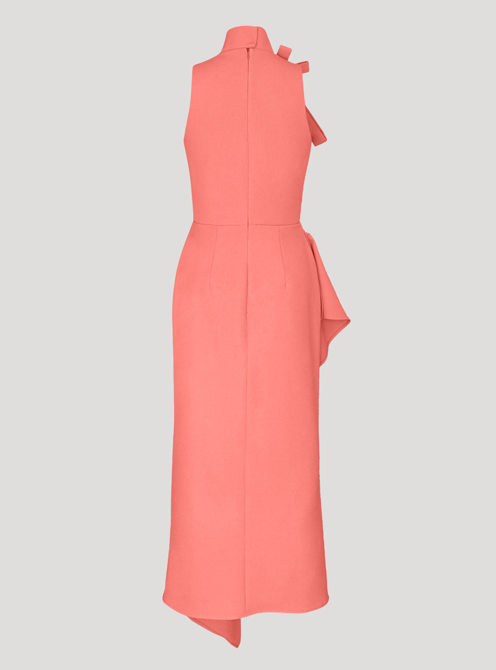 An elegant peach-colored midi dress with a mandarin collar, asymmetrical hem and bow accents. Perfect for a graceful statement at any celebration.