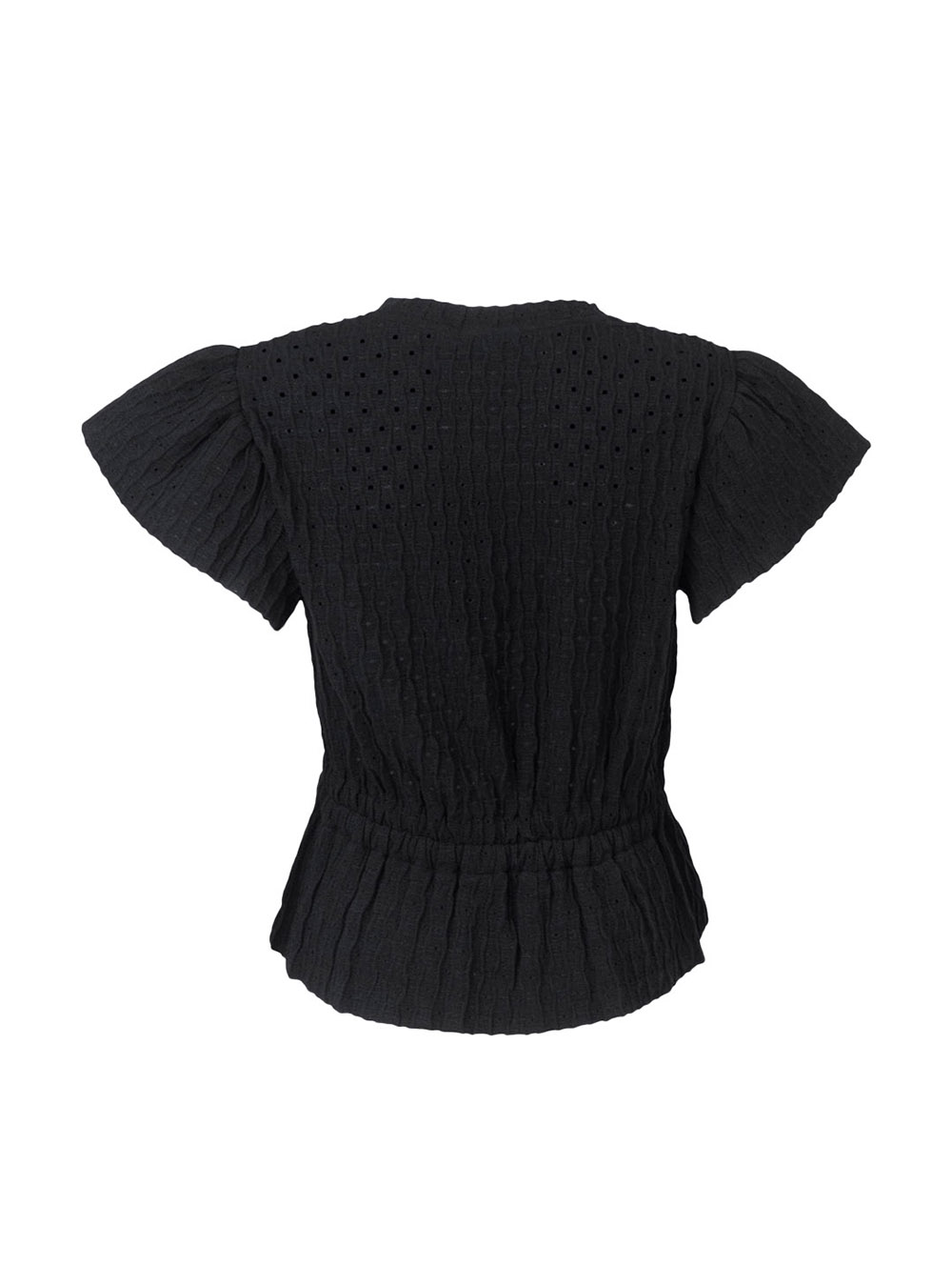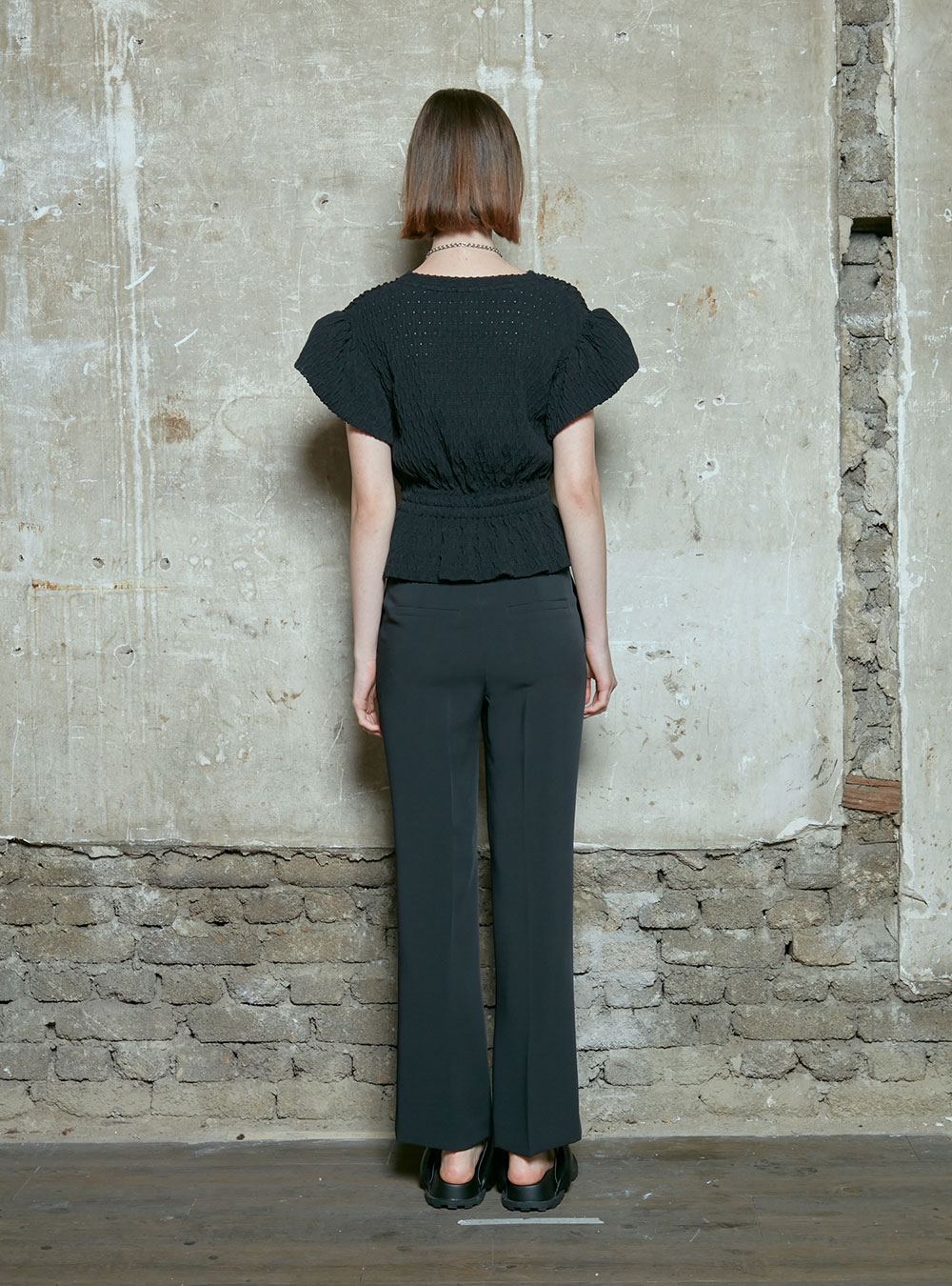 Puff sleeves with elastic waist. Features a textured fabric in jet black. A great everyday piece for work and casual styling.