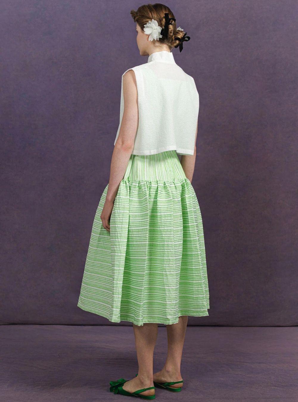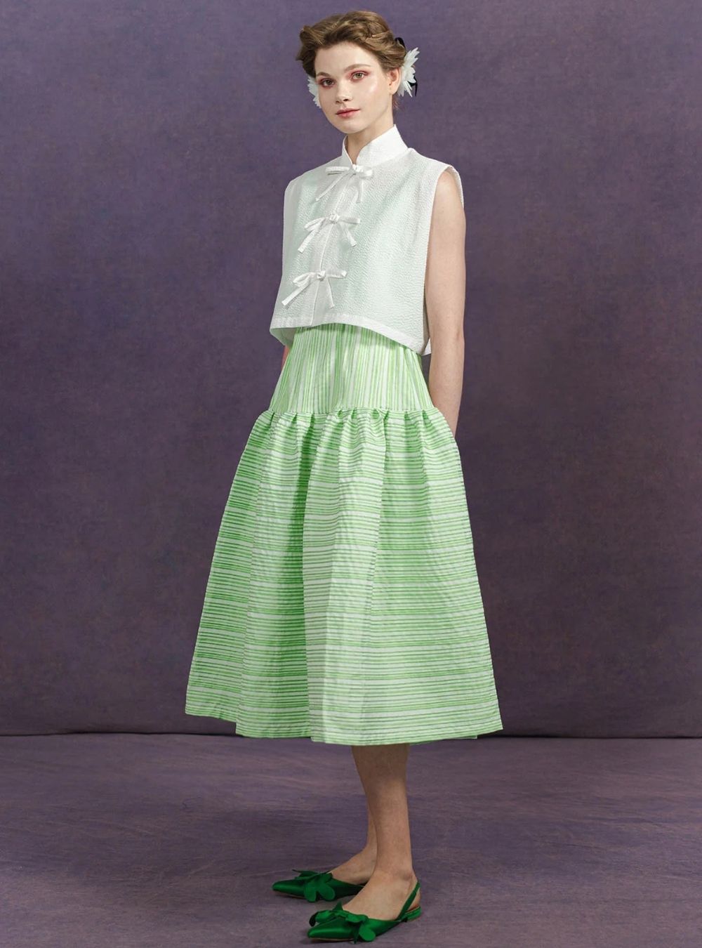 Sleeveless seersucker top with a mandarin collar and decorative bow button details.