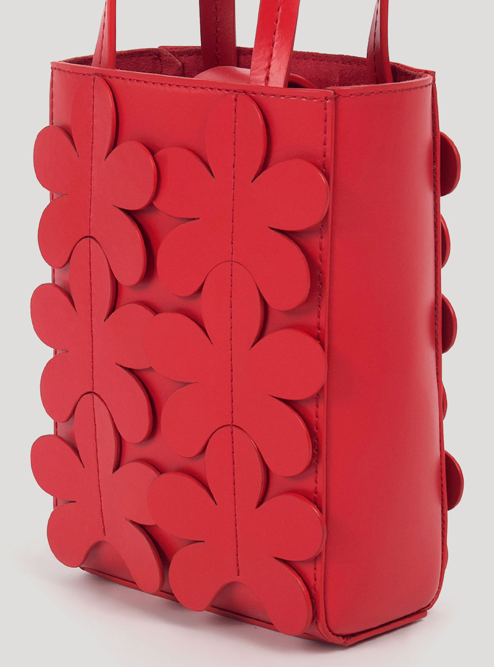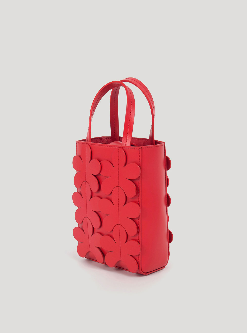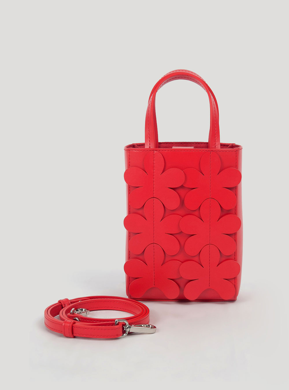 Compact yet bold, this bag features a striking sangria red tone, a textured saffiano finish, detachable strap, and a sculpted floral design.