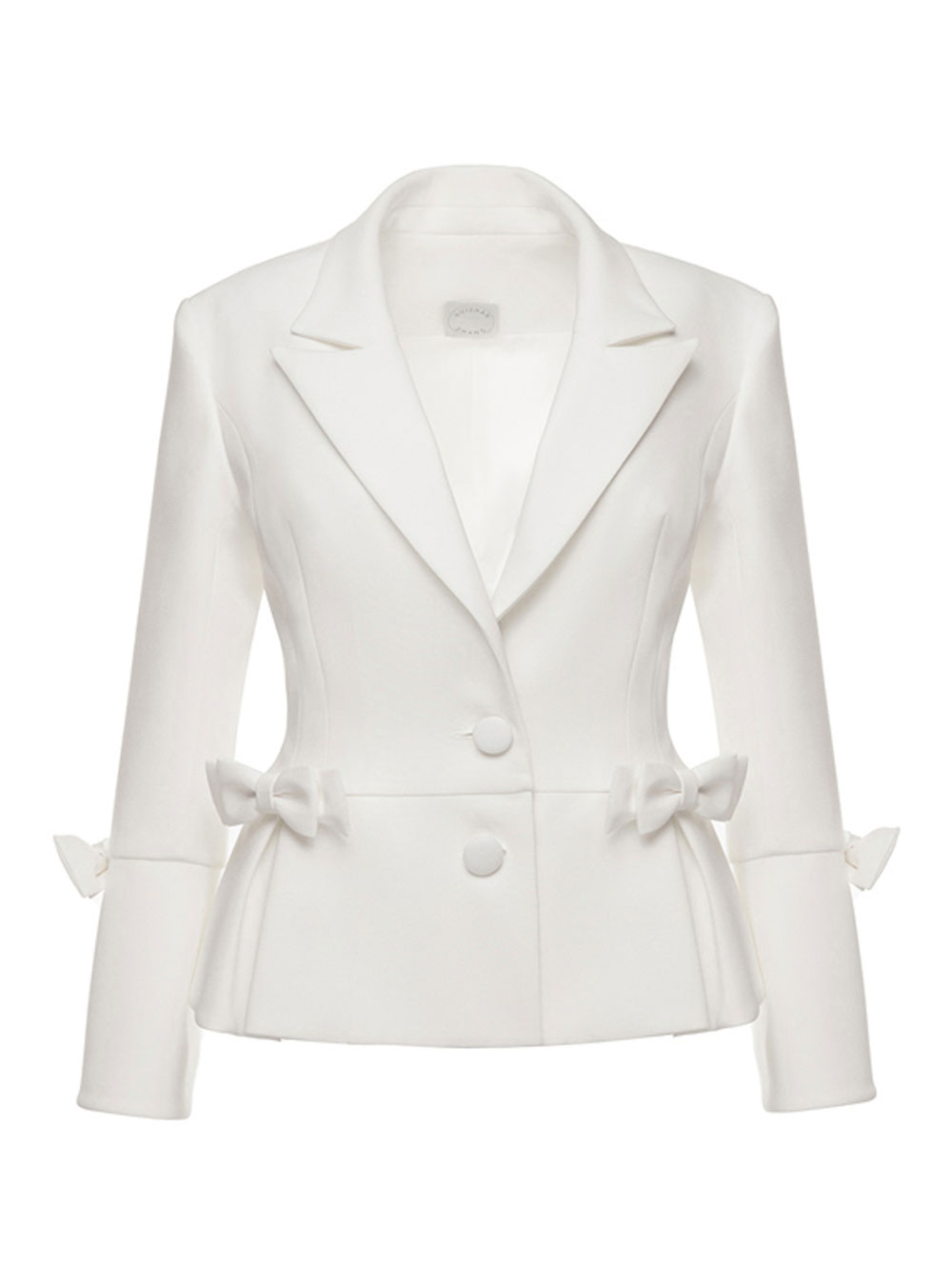 The Sanna Jacket is tailored from Italian recycled crepe, featuring a deep V-neck, two-button closure, and a nipped-in waist that creates a subtle peplum effect. Bow details on the sleeves and body add a delicate touch, blending sharp structure with soft accents. Made from recycled polyester, the fabric is certified by the Global Recycled Standard.