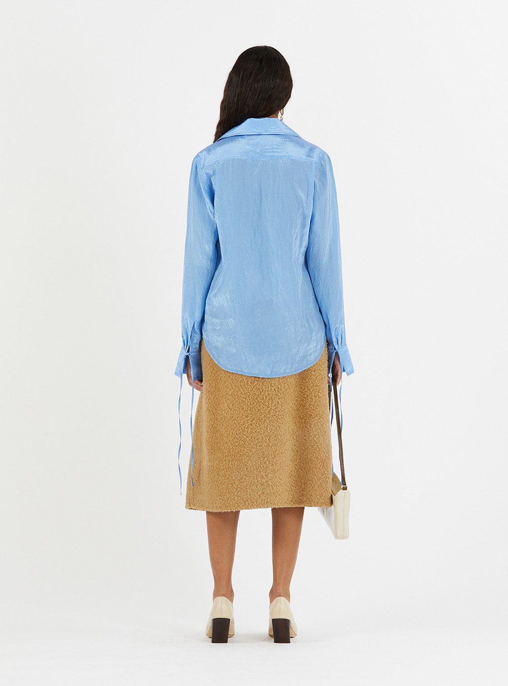 The Rejina Pyo Saskia Shirt in Viscose Blend Crinkle Blue is a flowy collared blouse with concealed buttons, ribbon tie detailing and cuffed sleeves. Made using Viscose sourced from certified responsibly managed forests.