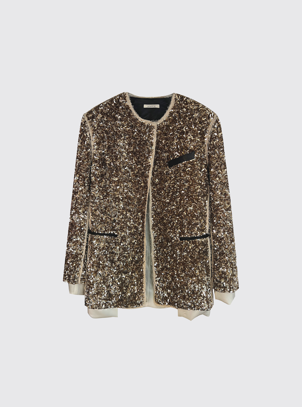 Shine bright in our Sequin Jacket, a dazzling addition to your wardrobe. This statement piece is embellished with shimmering sequins, making it perfect for special occasions or adding a touch of glamour to your everyday look.