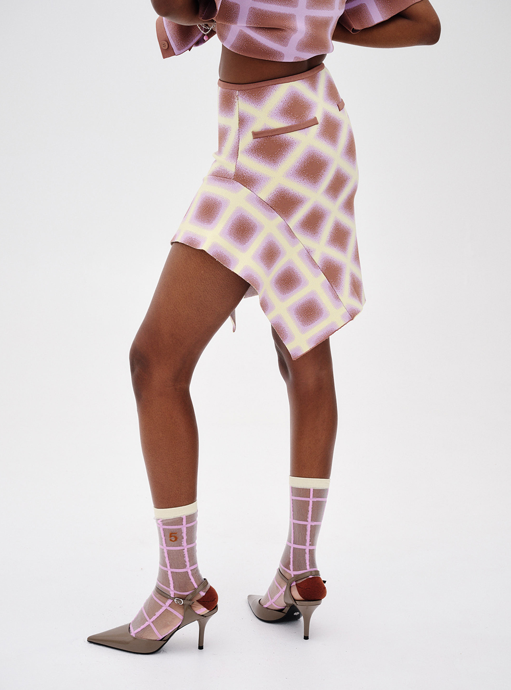 Windswept and whimsical best encapsulate PH5’s Fall/Winter 2024 collection. Birthed from the idea of a humble scarf, creative director Zoe Champion weaves a narrative rooted in her familial past—having learned how to knit one from her grandmother. Designs play with texture and draping to emulate the movement of tossing a scarf over one’s shoulder and how it moves in the wind. For this season, the label’s signature gradient jacquard is presented in high-octane variations—black-and-white, electric blue and brown-and-pink.