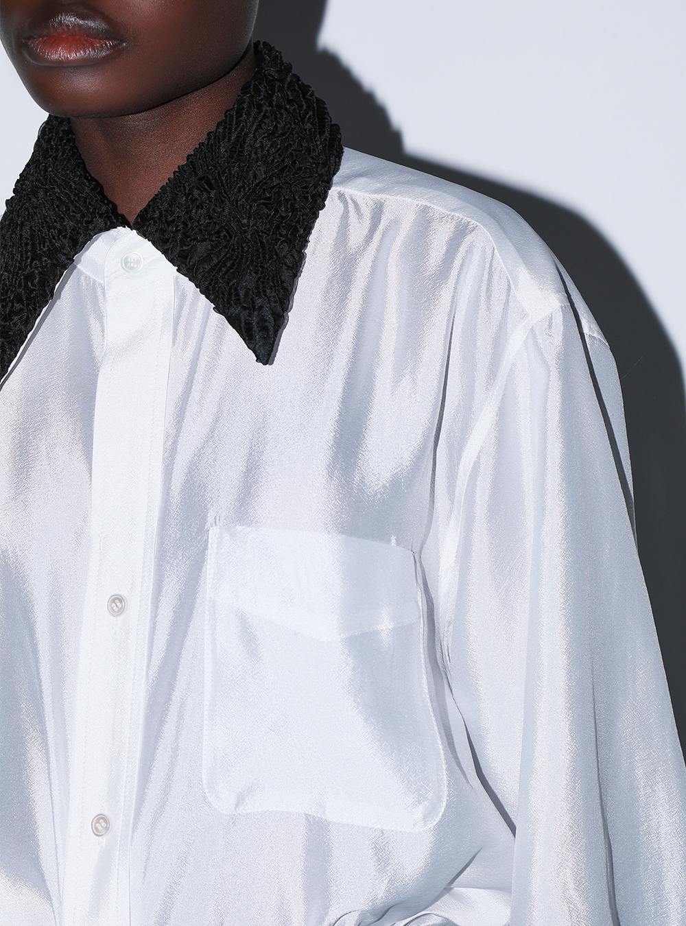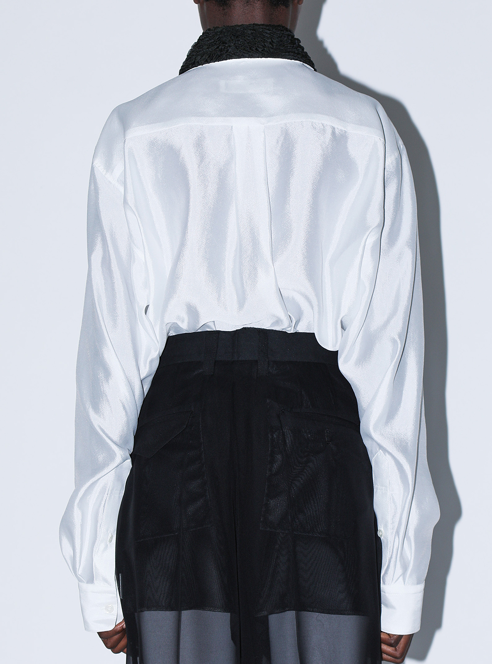 A relaxed fit sheer shirt with a contrasting silk collar that features a rouched texture and contrasting sleeves panels that run along the side.
