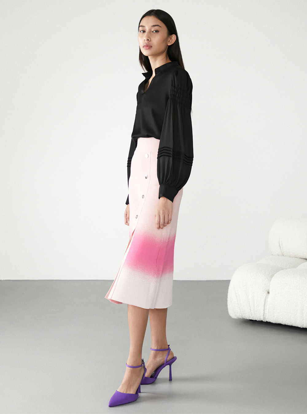A classic smocking pintuck sleeved blouse in black for casual Fridays or a day out. Note the open mandarin collar and v-neck. Great for pairing with tailored bottoms or a cute skirt.