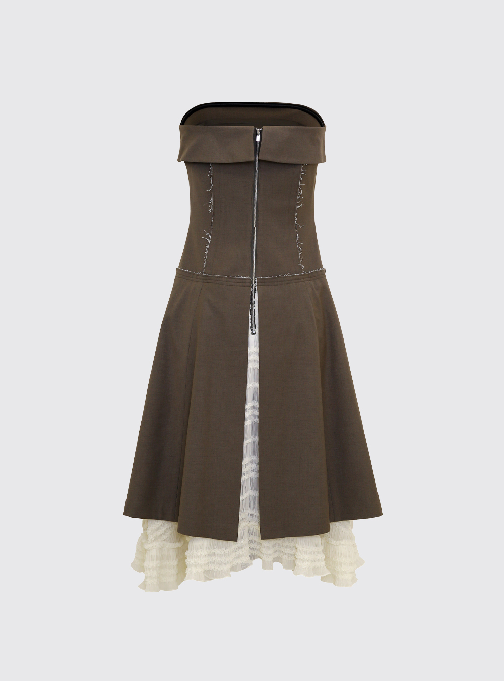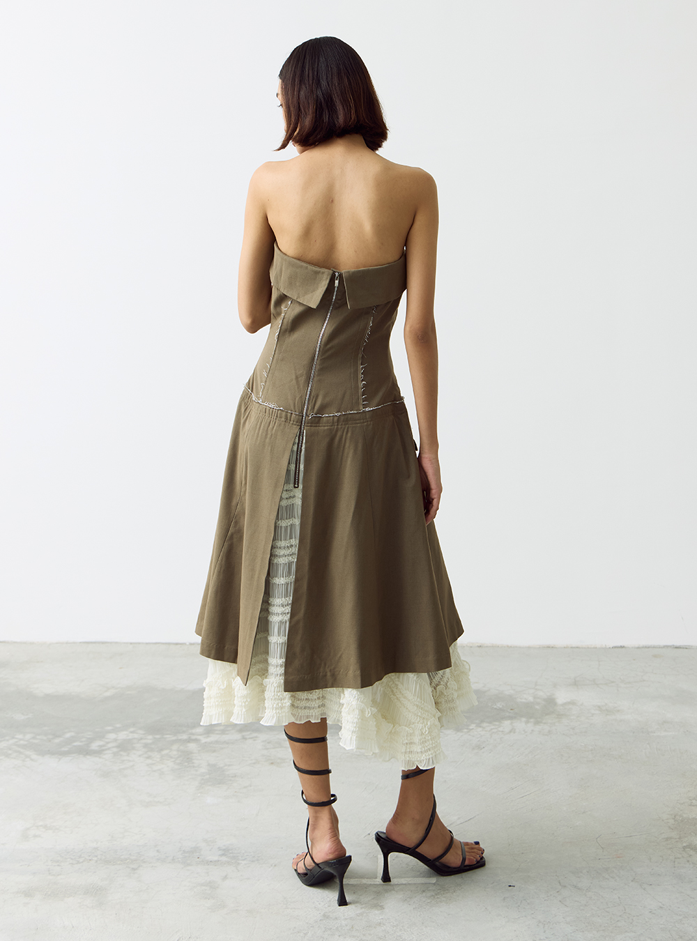 The Strapless Dress With Laces in Khaki Green features intricate lace details for a romantic yet modern appeal. Its flattering silhouette and unique design make it a perfect choice for event wear.