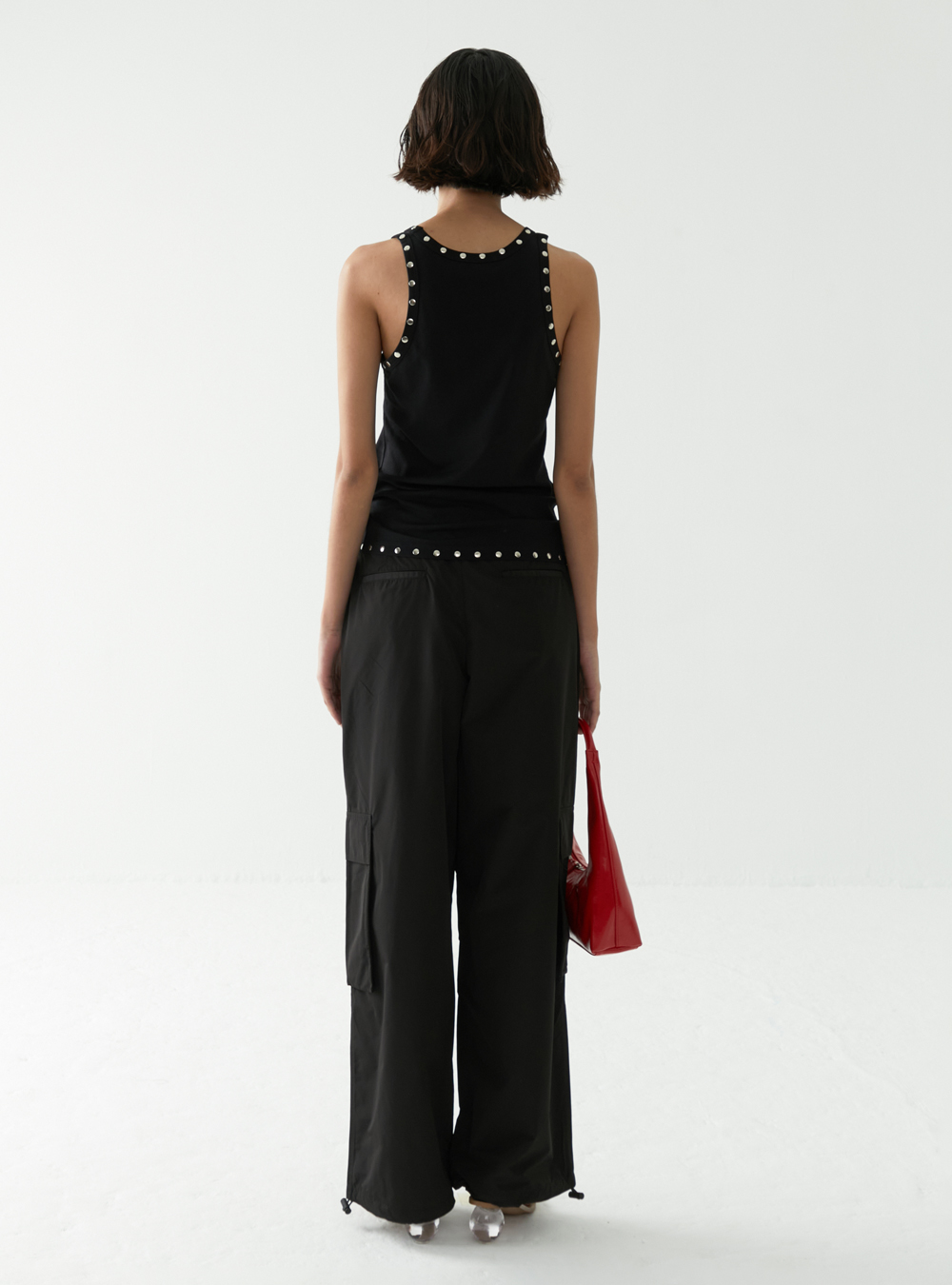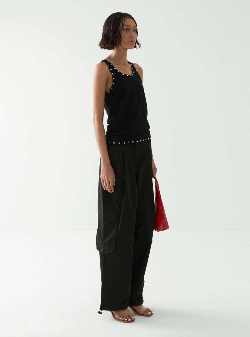Showcase your bold style with the Studded Logo Tank Top. Adorned with eye-catching studs forming a chic logo design, this tank top is perfect for making a statement. Pair it with anything from tailored trousers to distressed jeans for an effortlessly cool look.