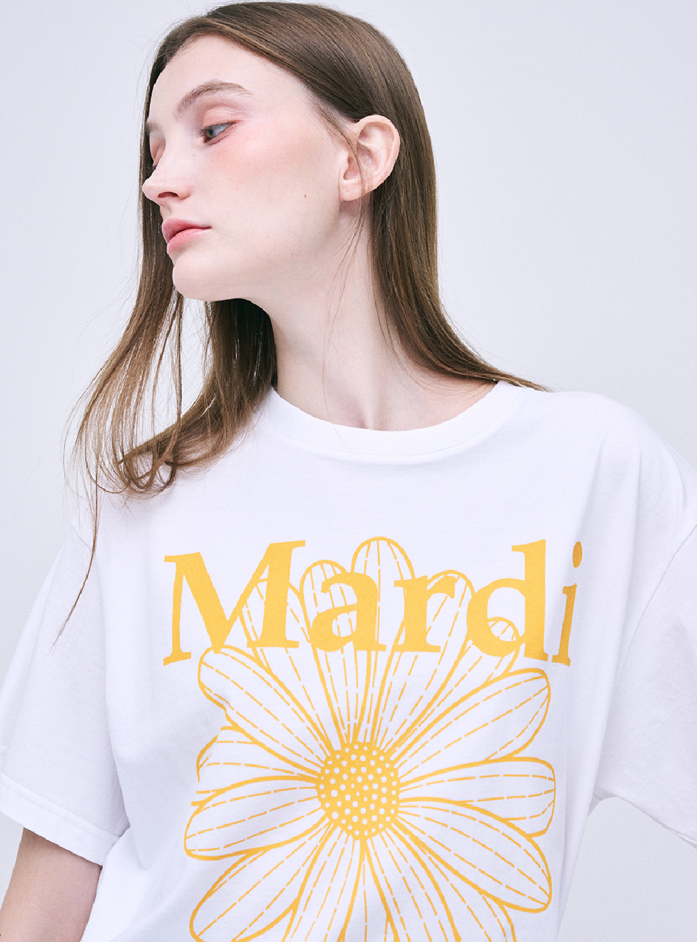 The T-Shirt Flowermardi in White Tangerine features a delicate signature Flowermardi print that stands out as a bold yet sophisticated choice for any casual occasion.